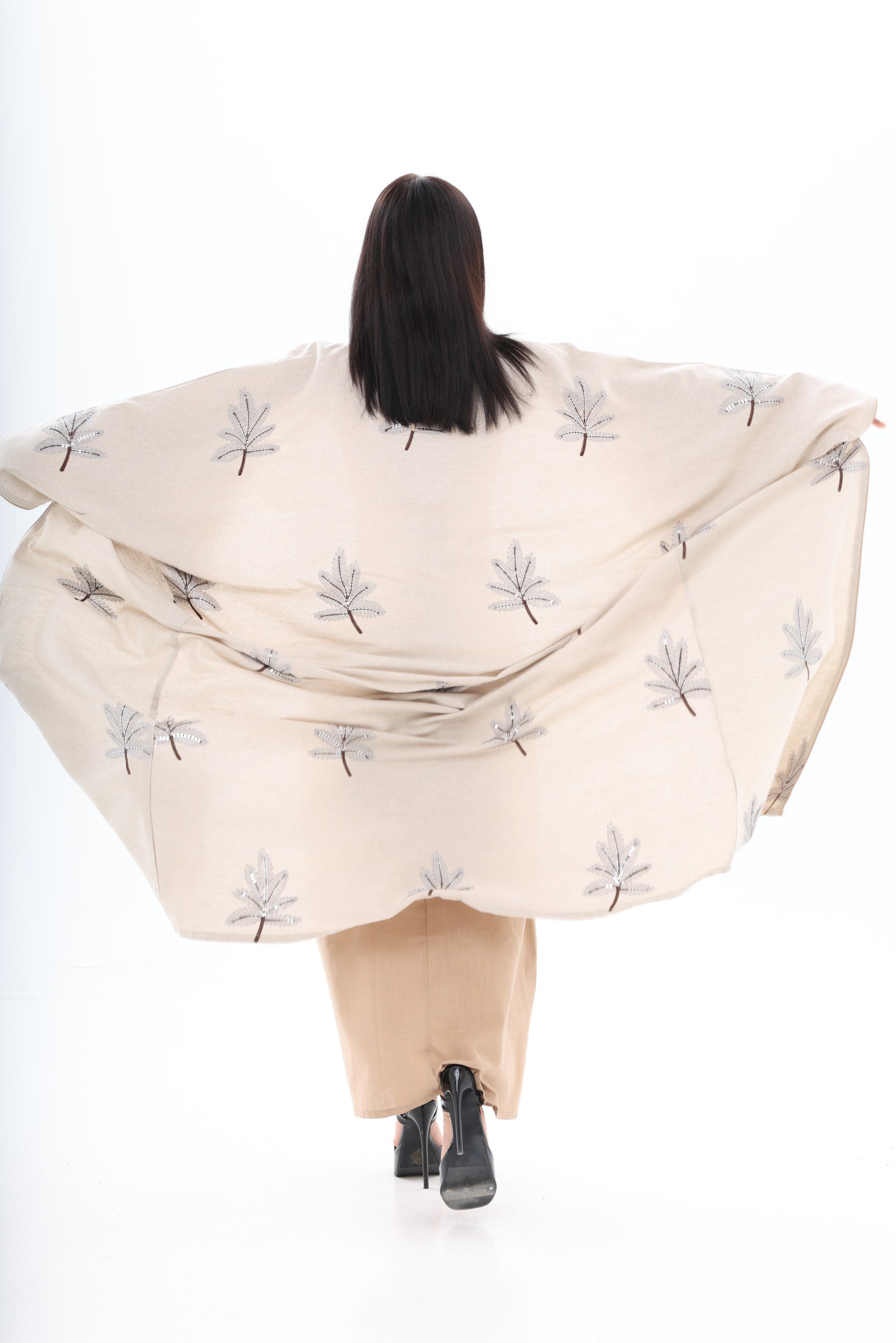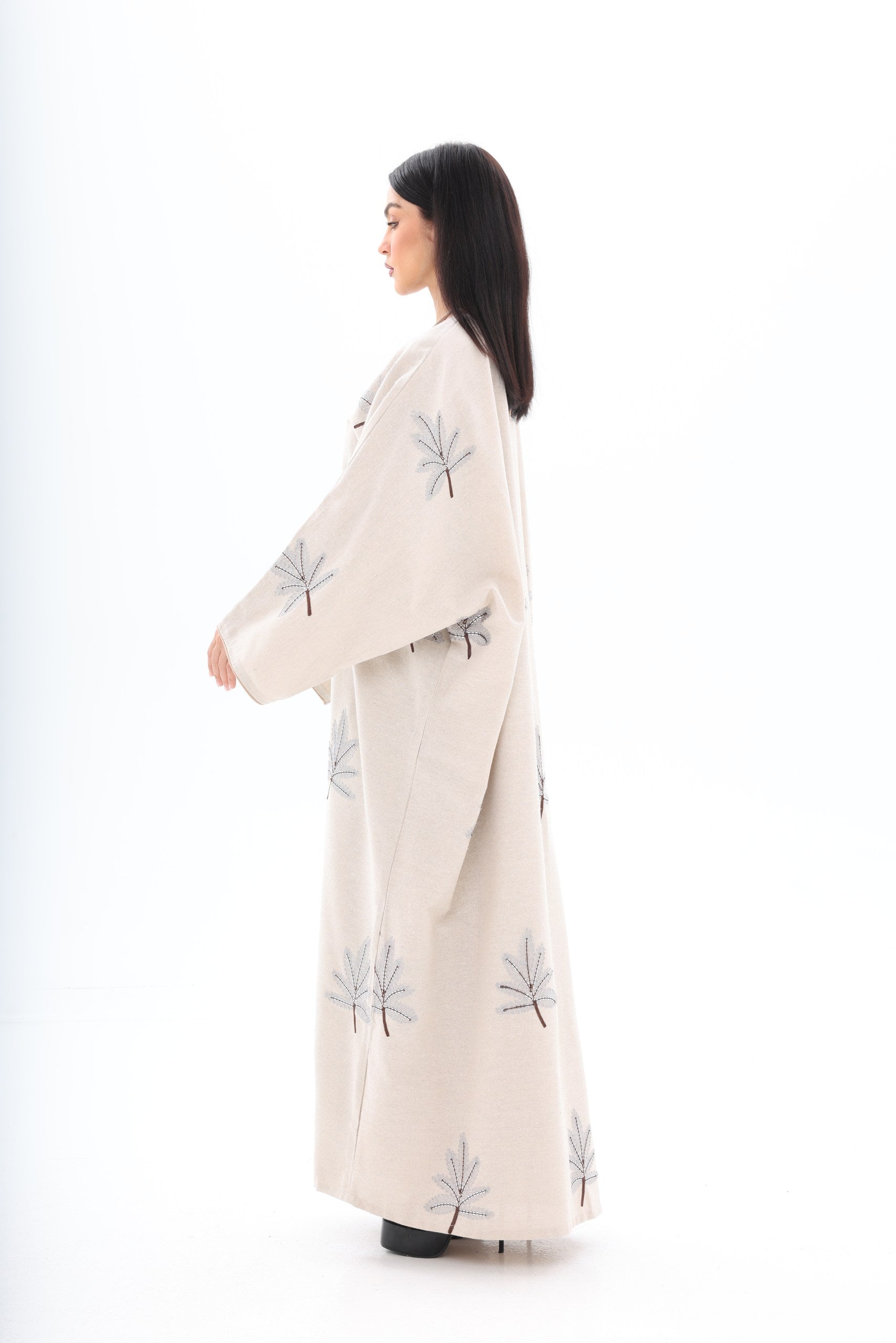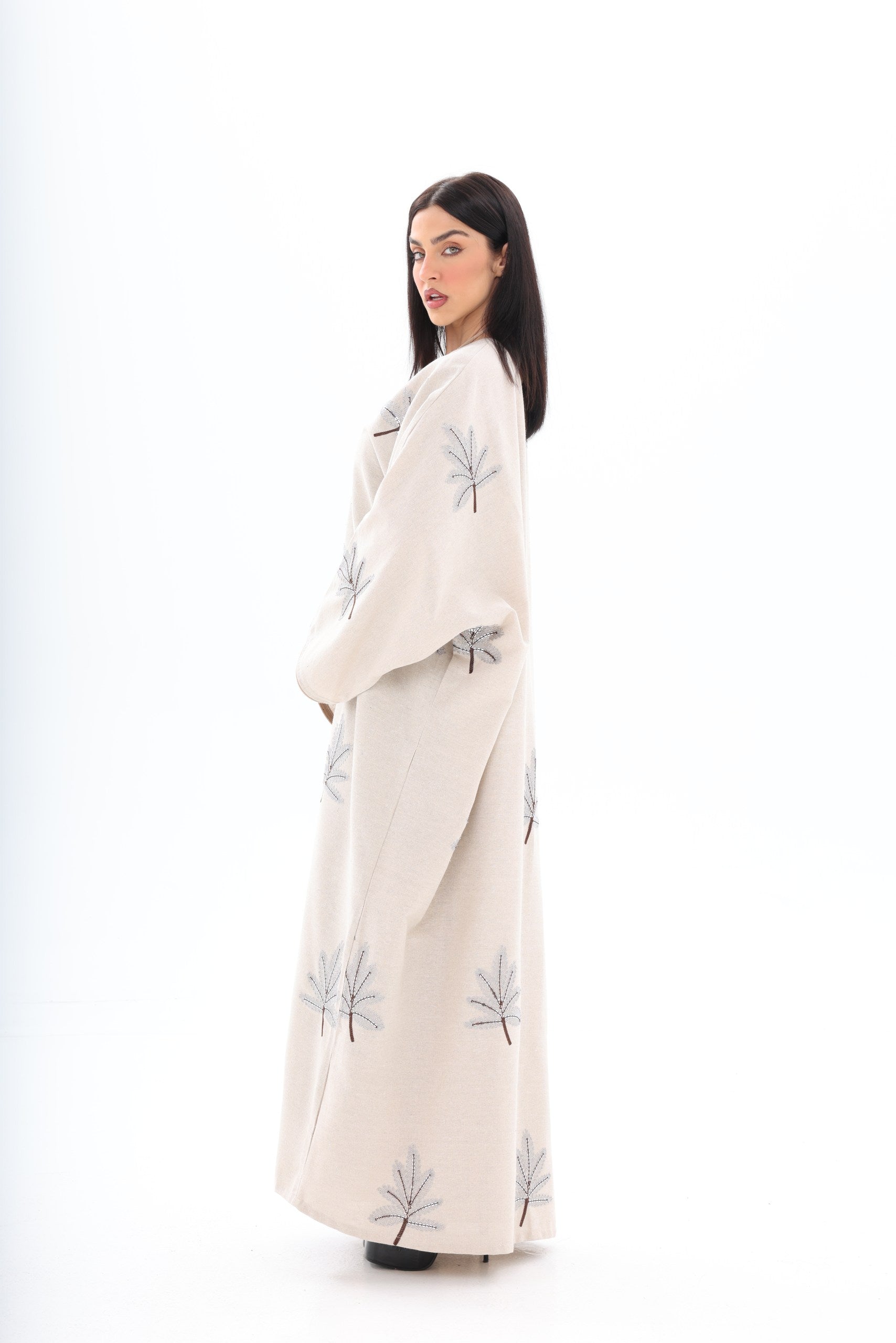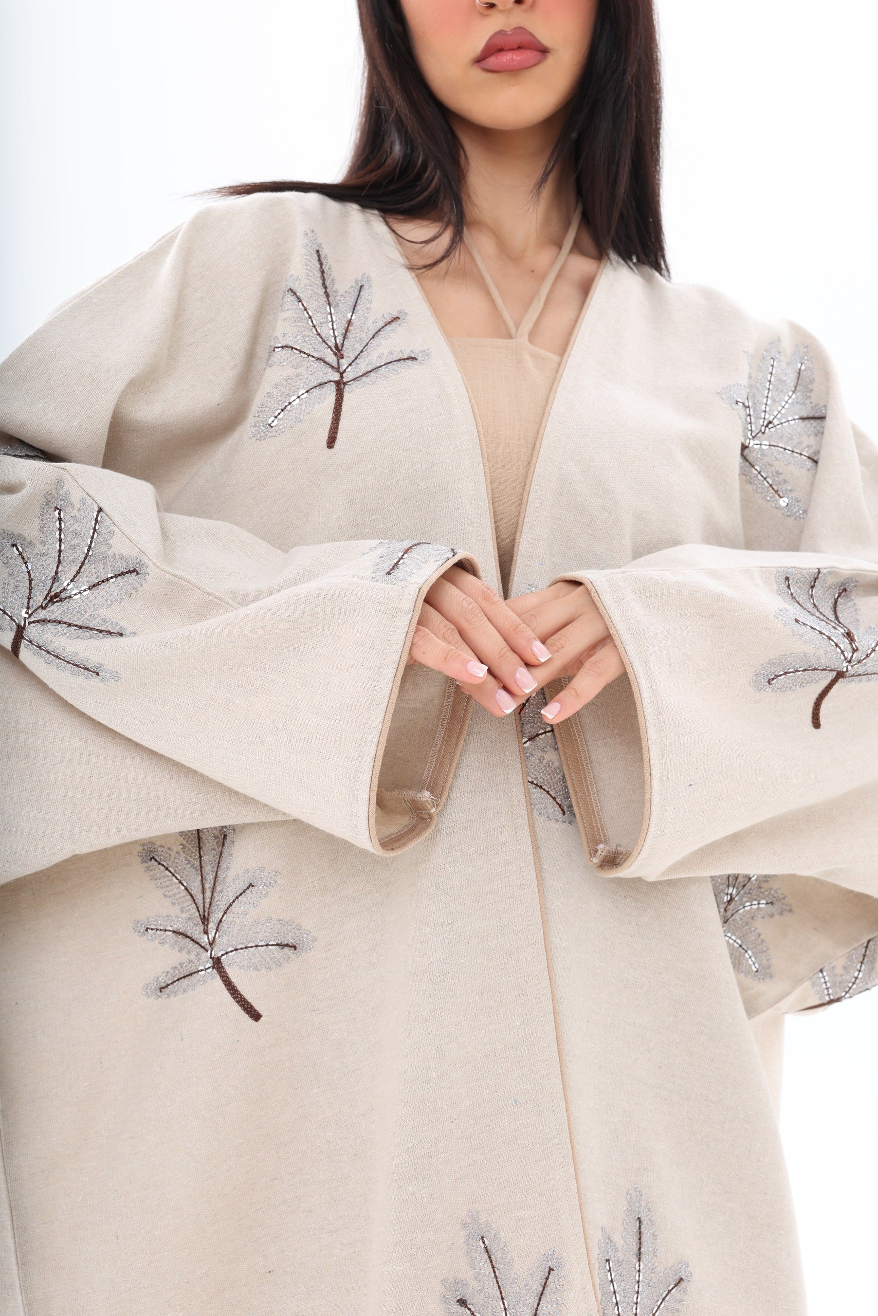 Sophisticated Beige Abaya Dress with Embroidered Accents