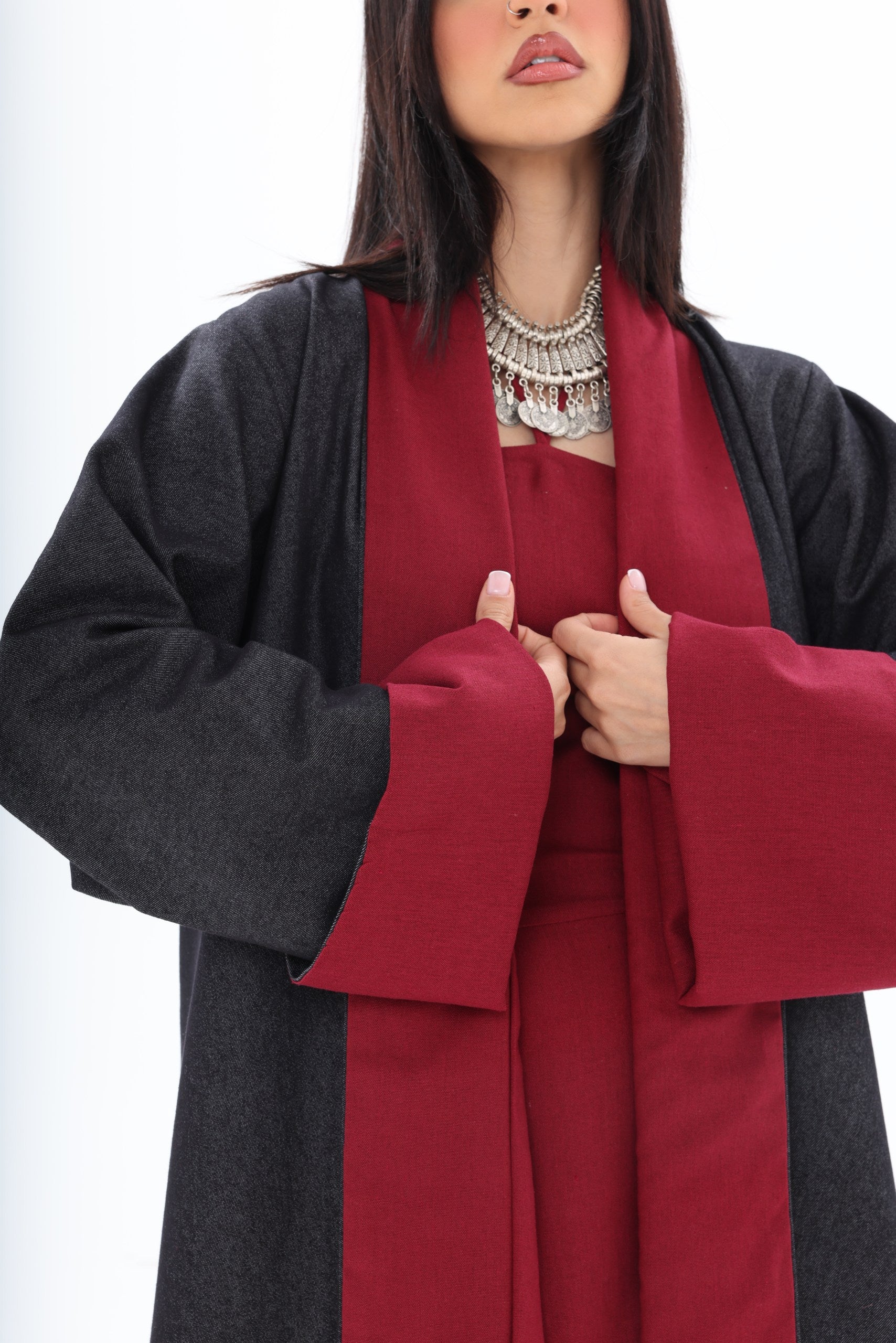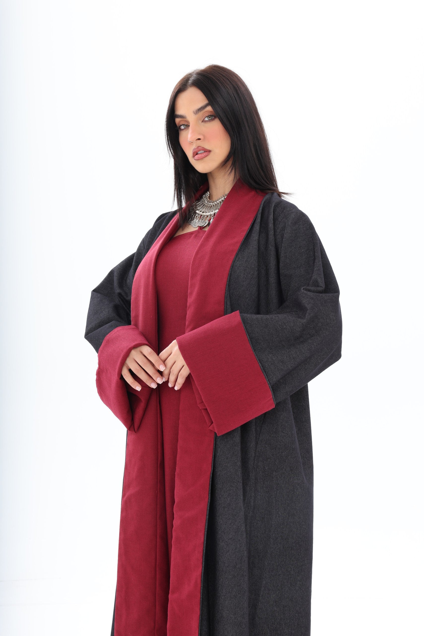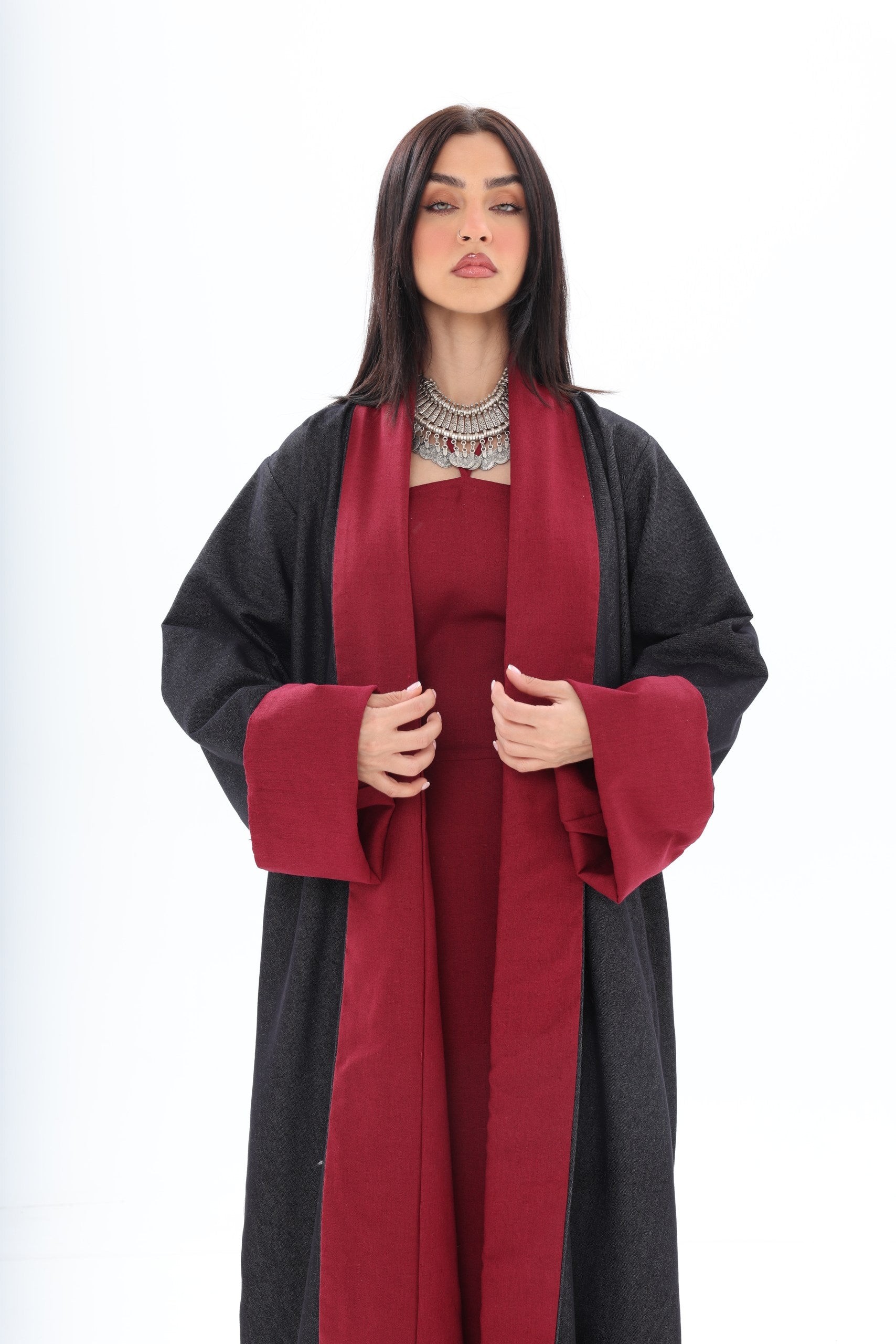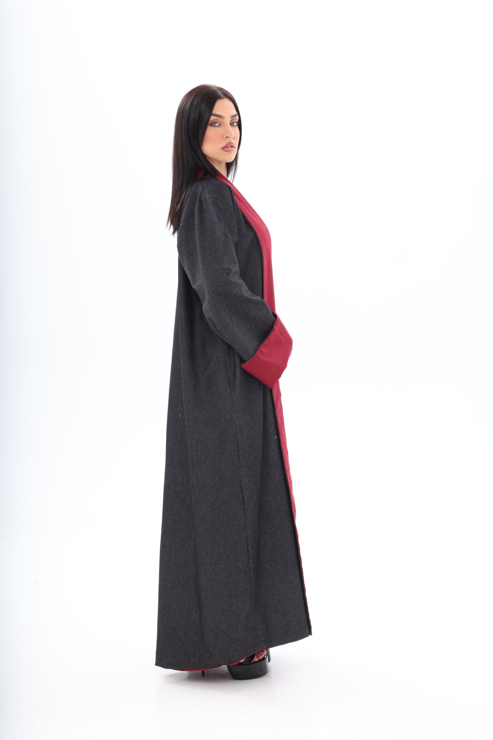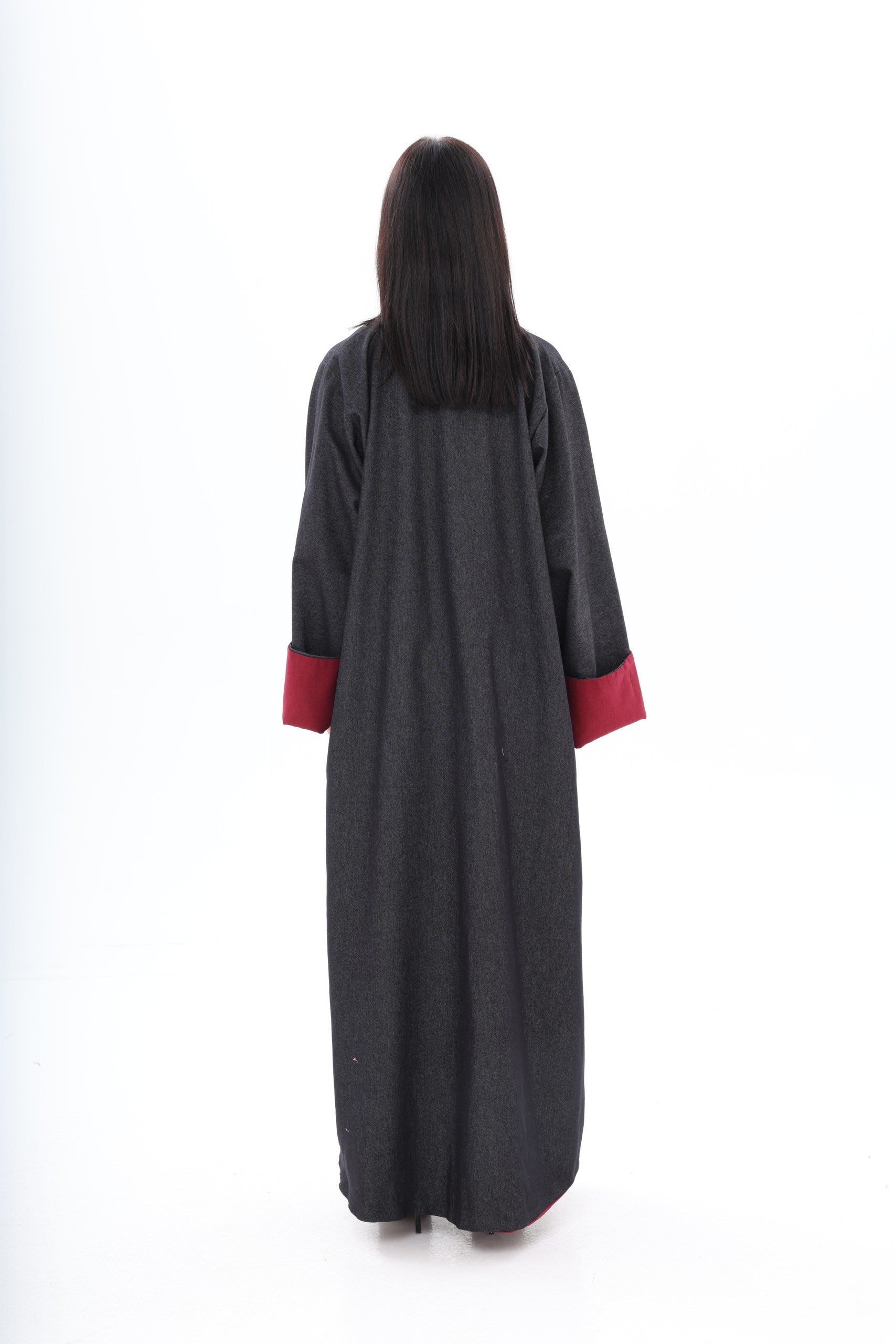 Roh is a contemporary, double-sided abaya designed for the modern woman who appreciates versatility and style. The dark denim exterior provides a sleek, urban aesthetic suitable for everyday wear, while the red linen interior adds an unexpected pop of color, reflecting personality and confidence when revealed through movement or styling.