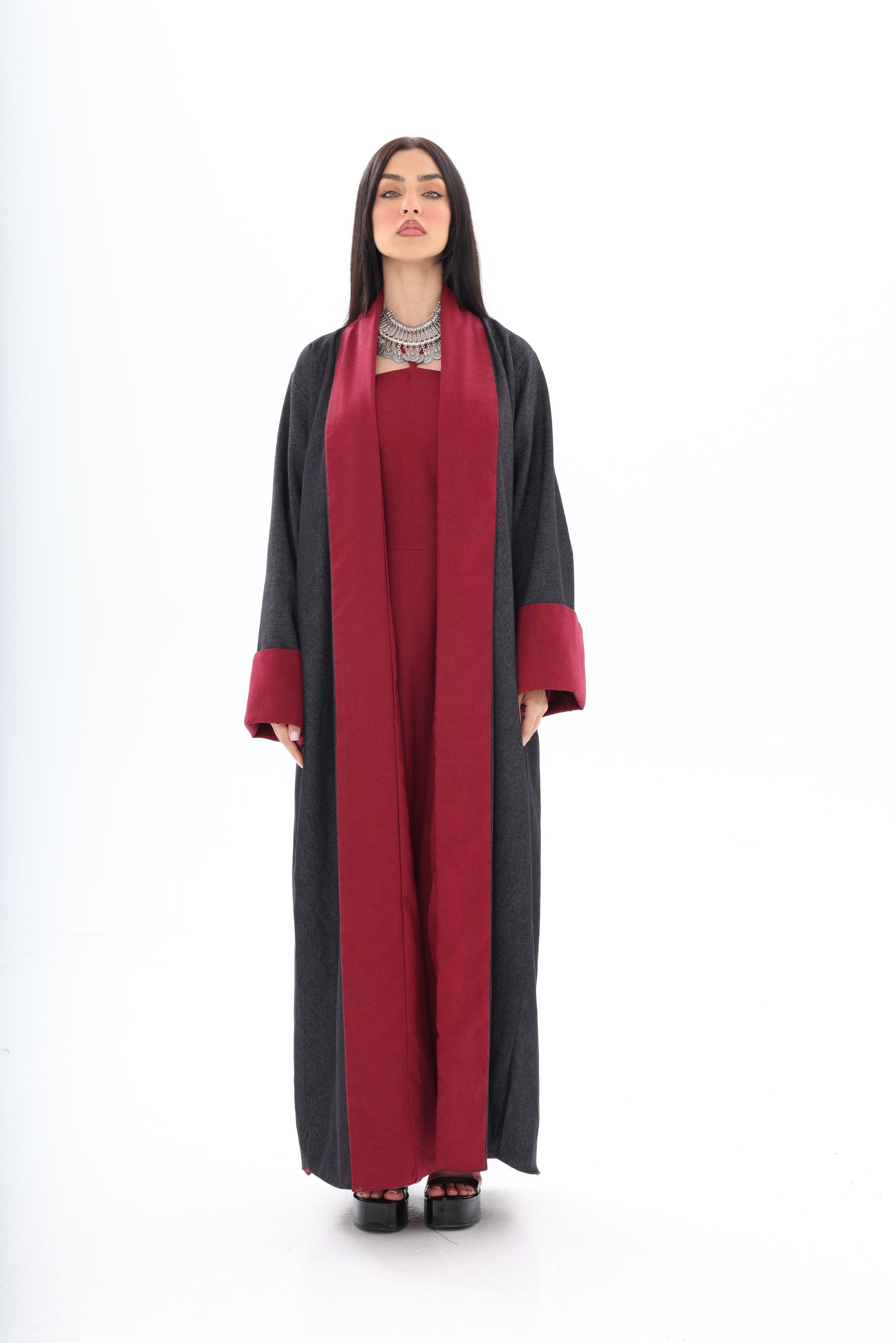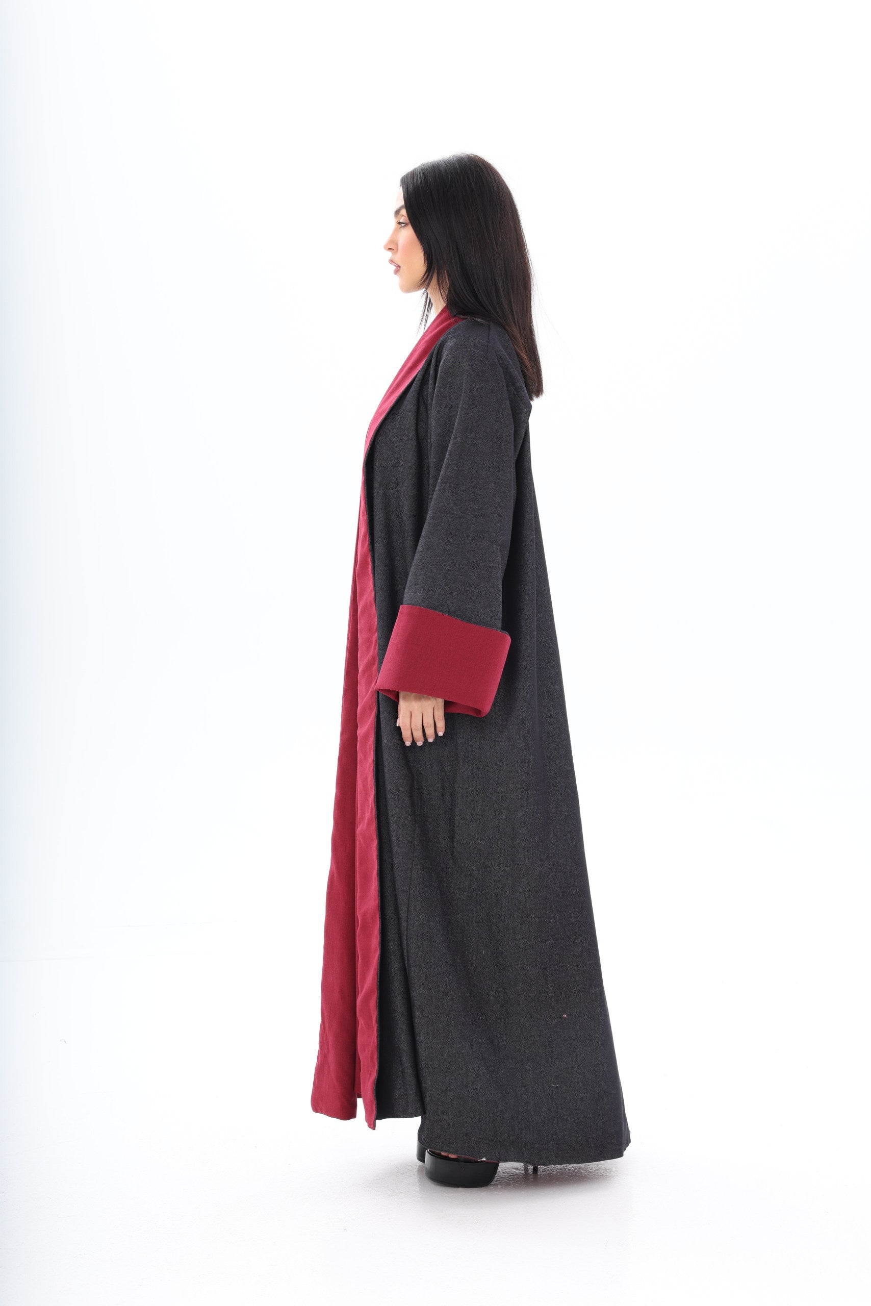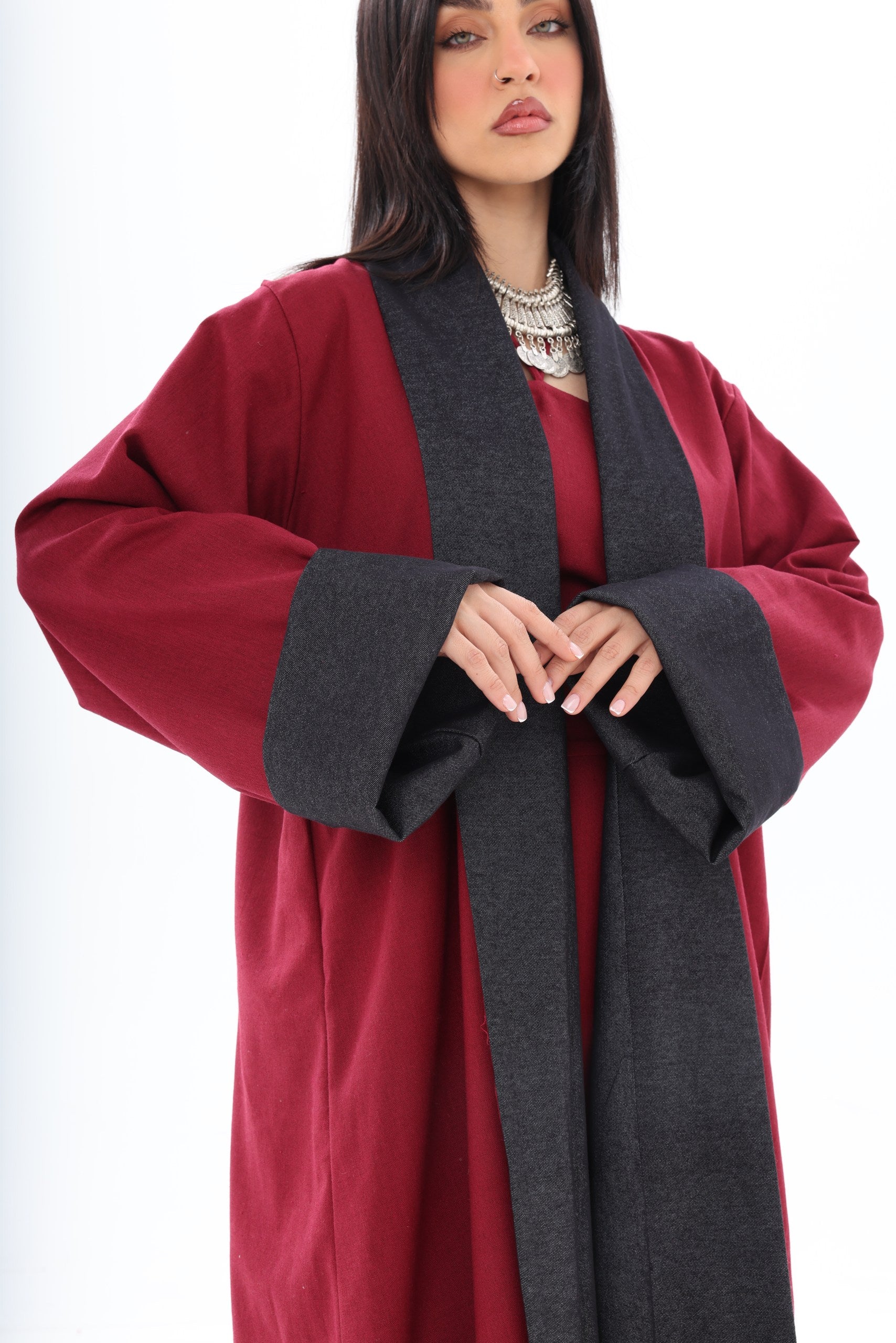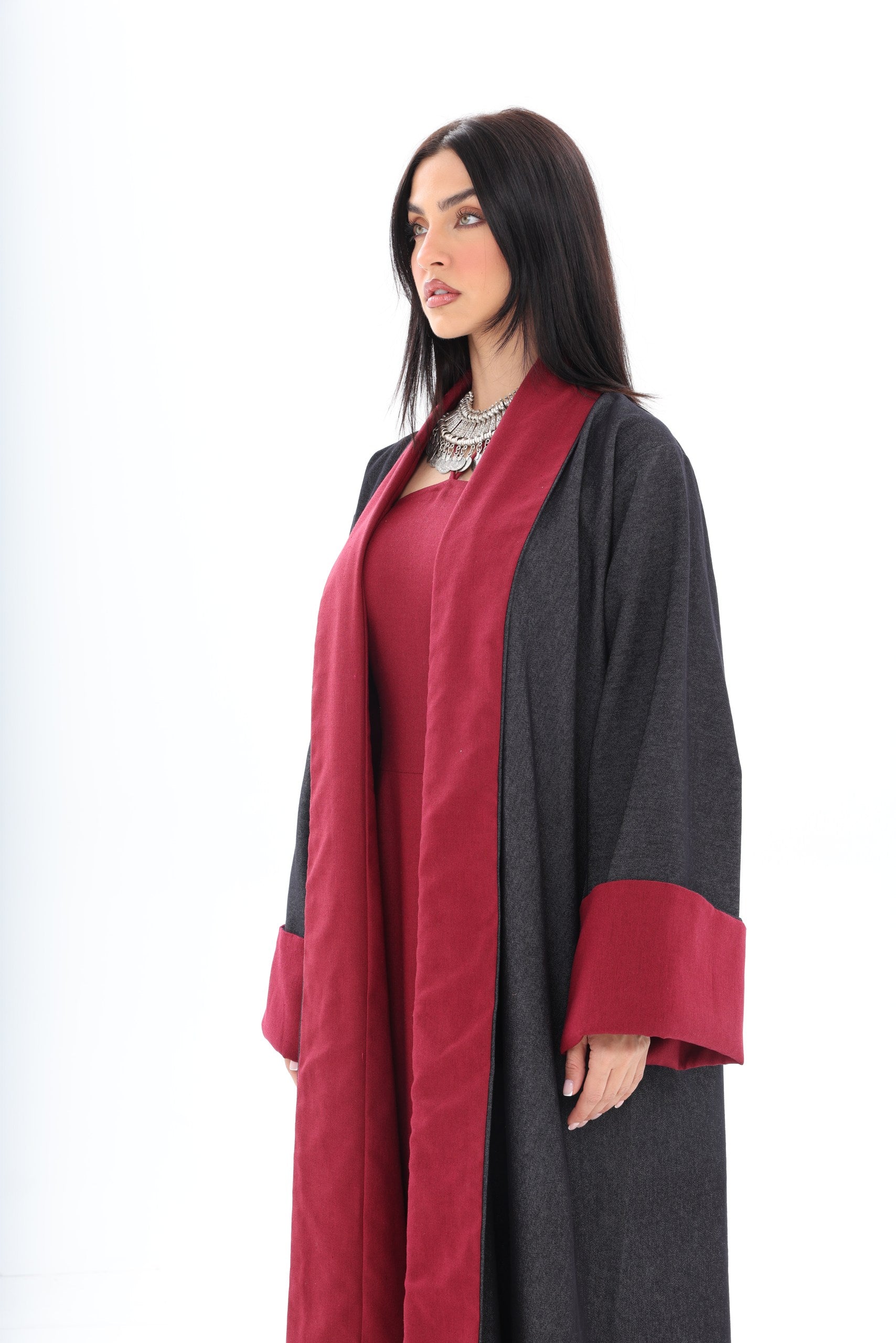Roh is a contemporary, double-sided abaya designed for the modern woman who appreciates versatility and style. The dark denim exterior provides a sleek, urban aesthetic suitable for everyday wear, while the red linen interior adds an unexpected pop of color, reflecting personality and confidence when revealed through movement or styling.