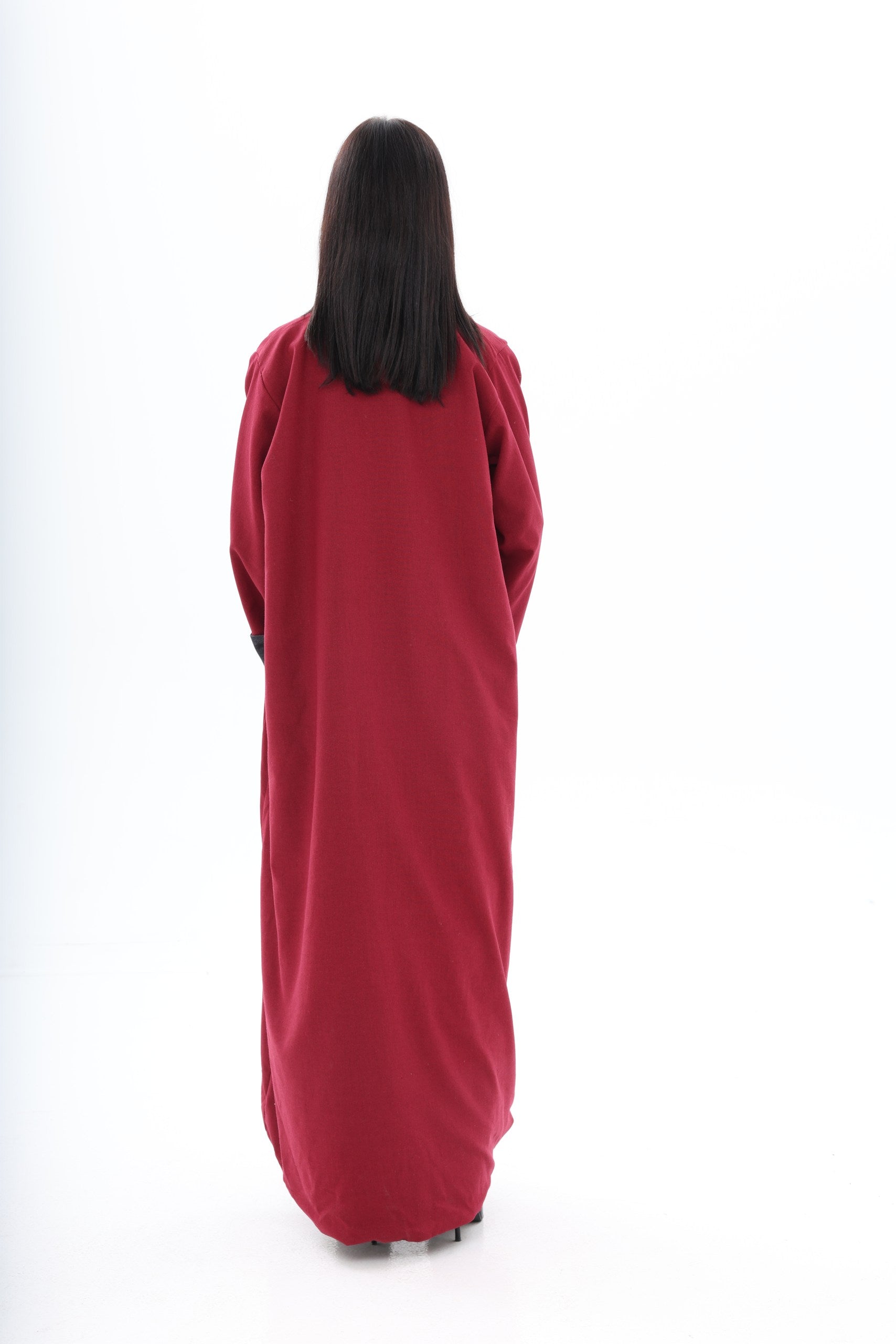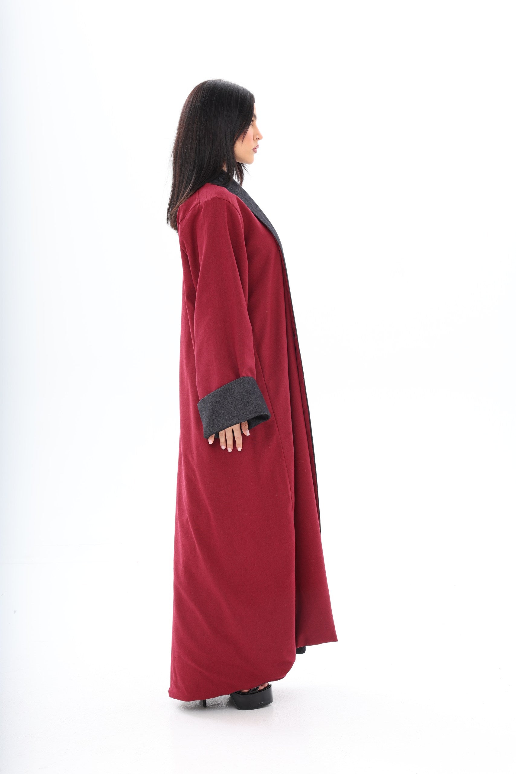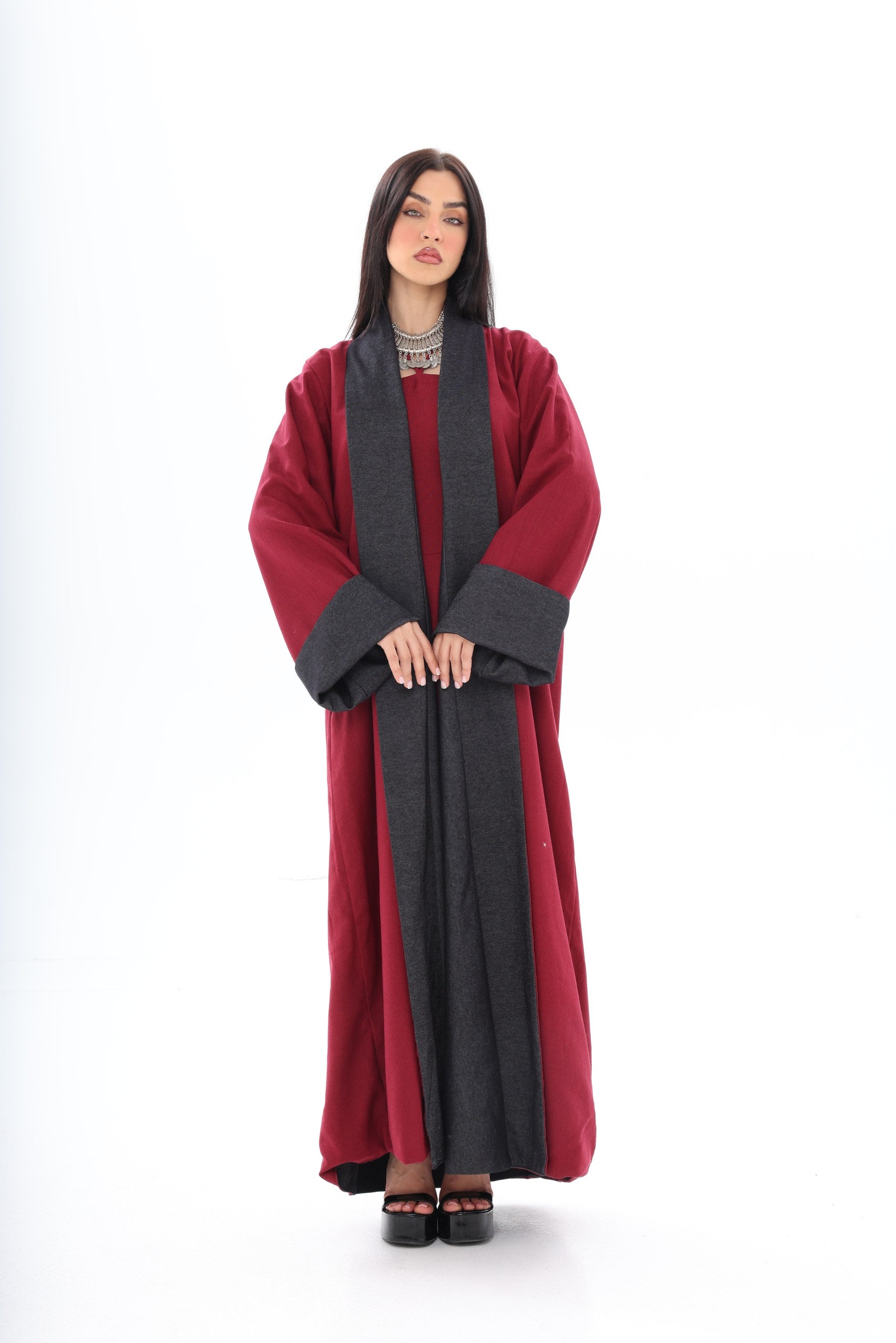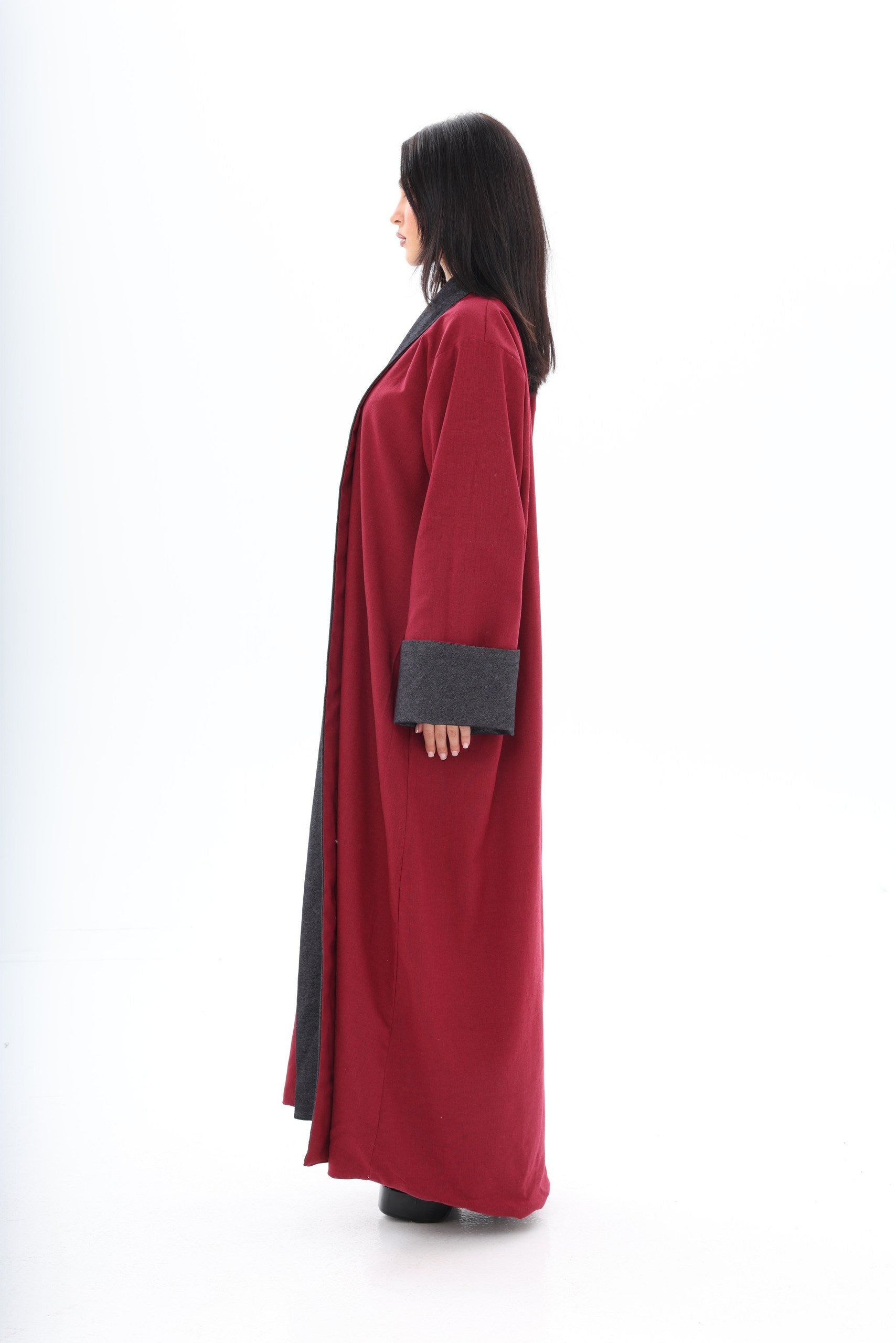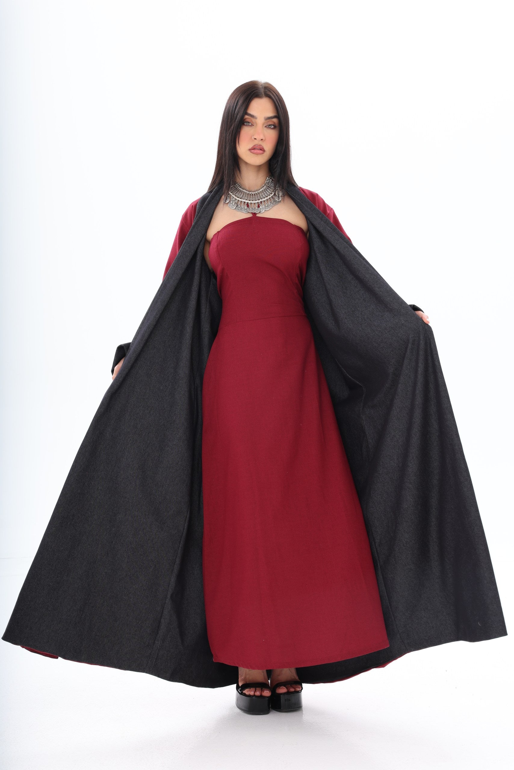 Roh is a contemporary, double-sided abaya designed for the modern woman who appreciates versatility and style. The dark denim exterior provides a sleek, urban aesthetic suitable for everyday wear, while the red linen interior adds an unexpected pop of color, reflecting personality and confidence when revealed through movement or styling.