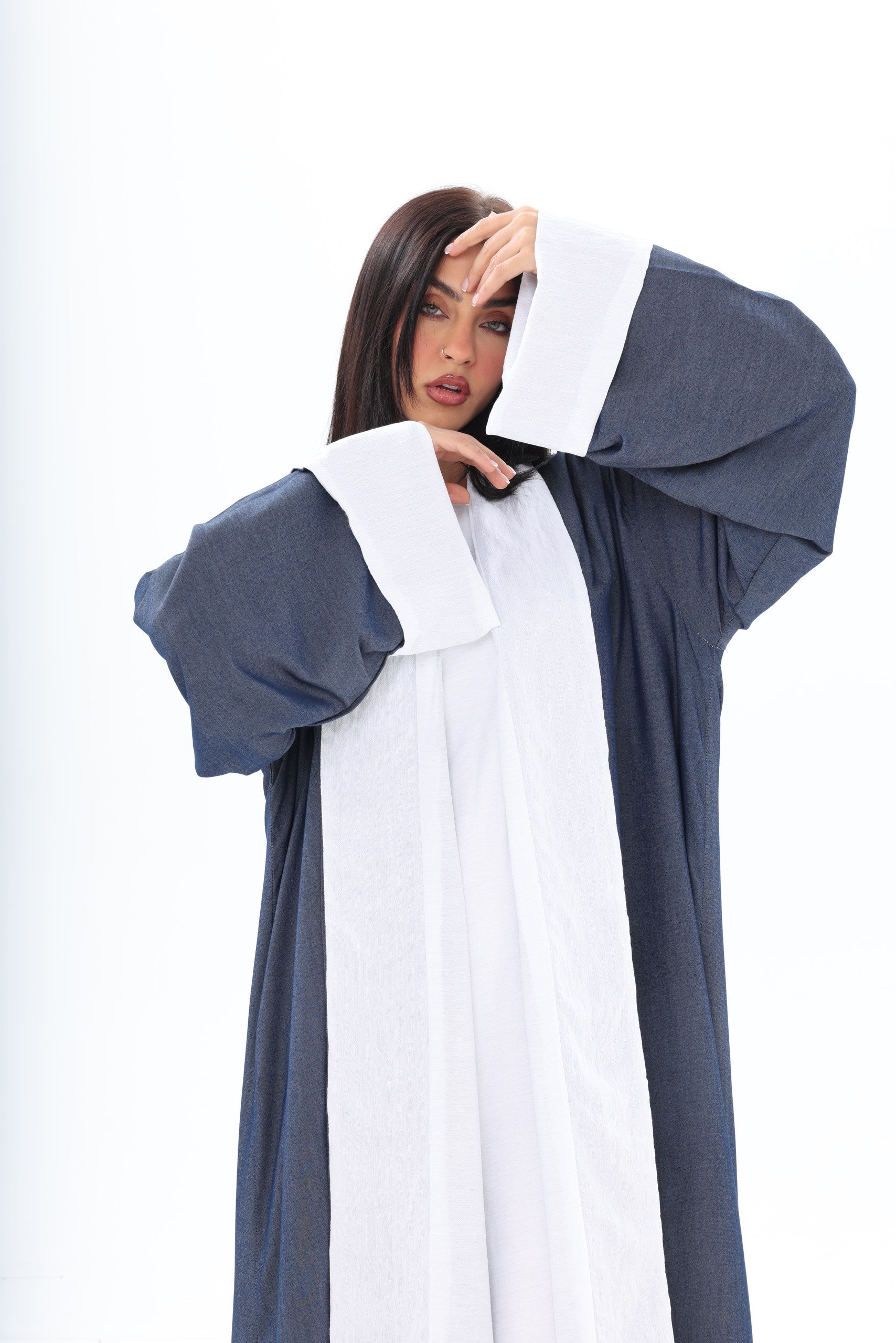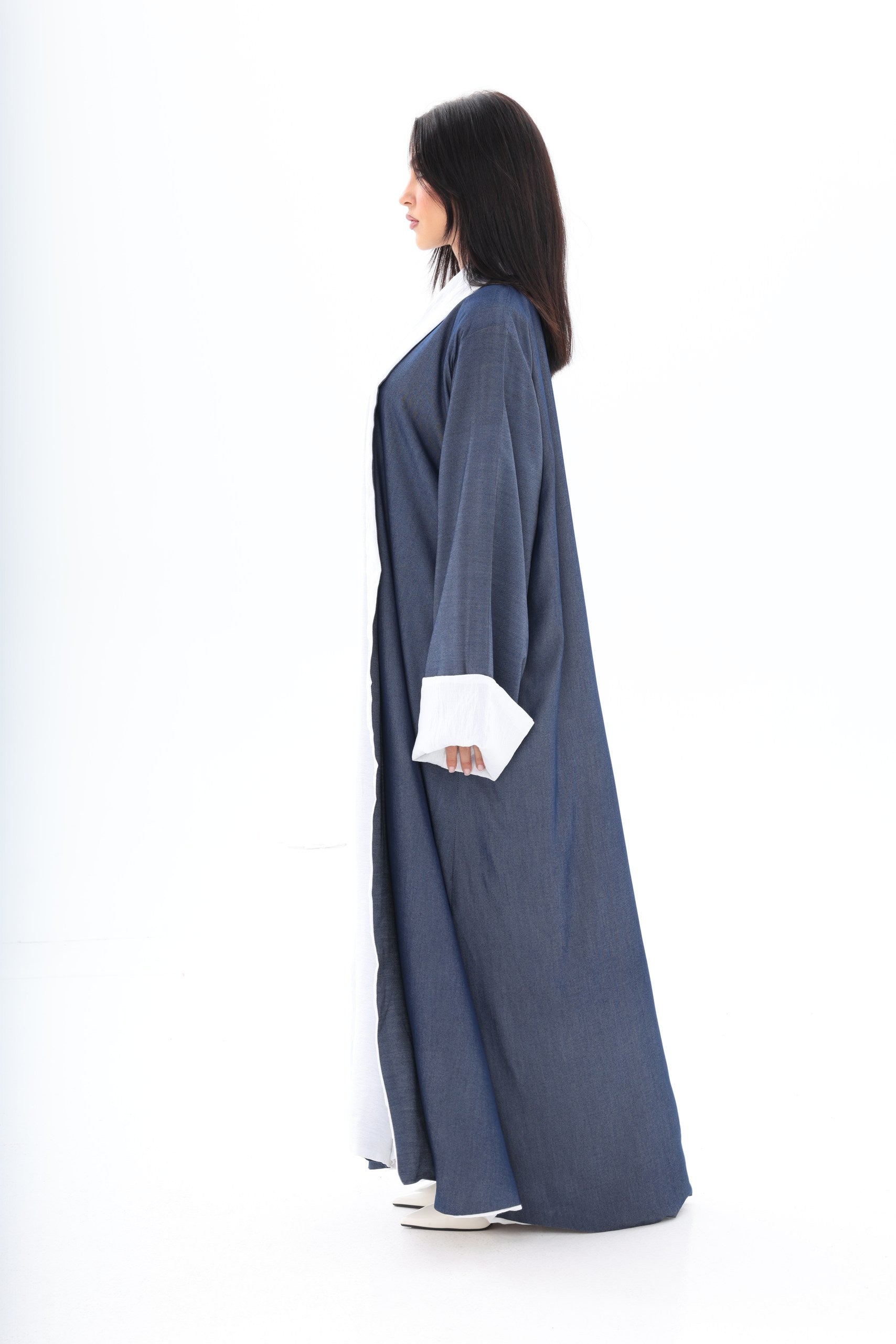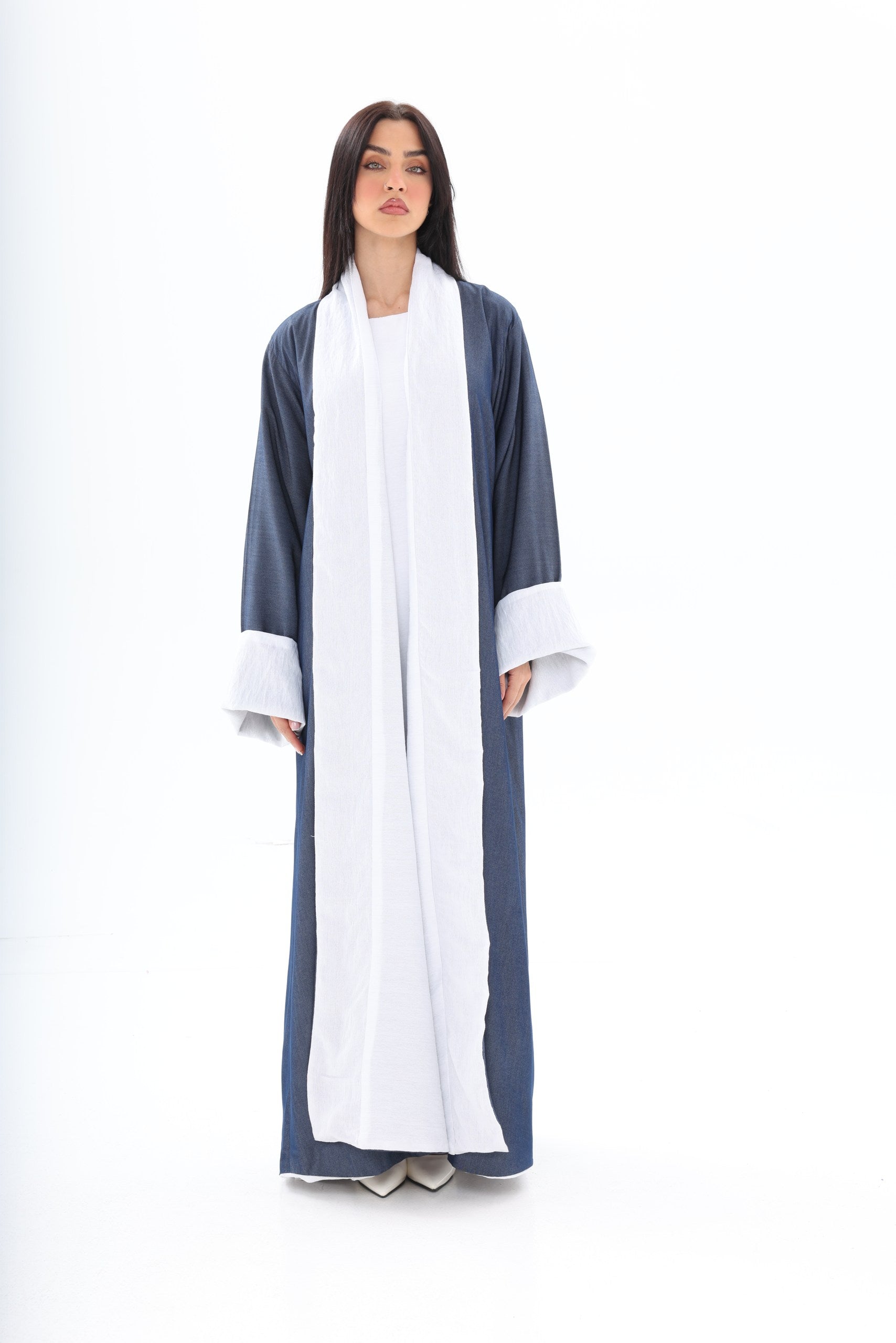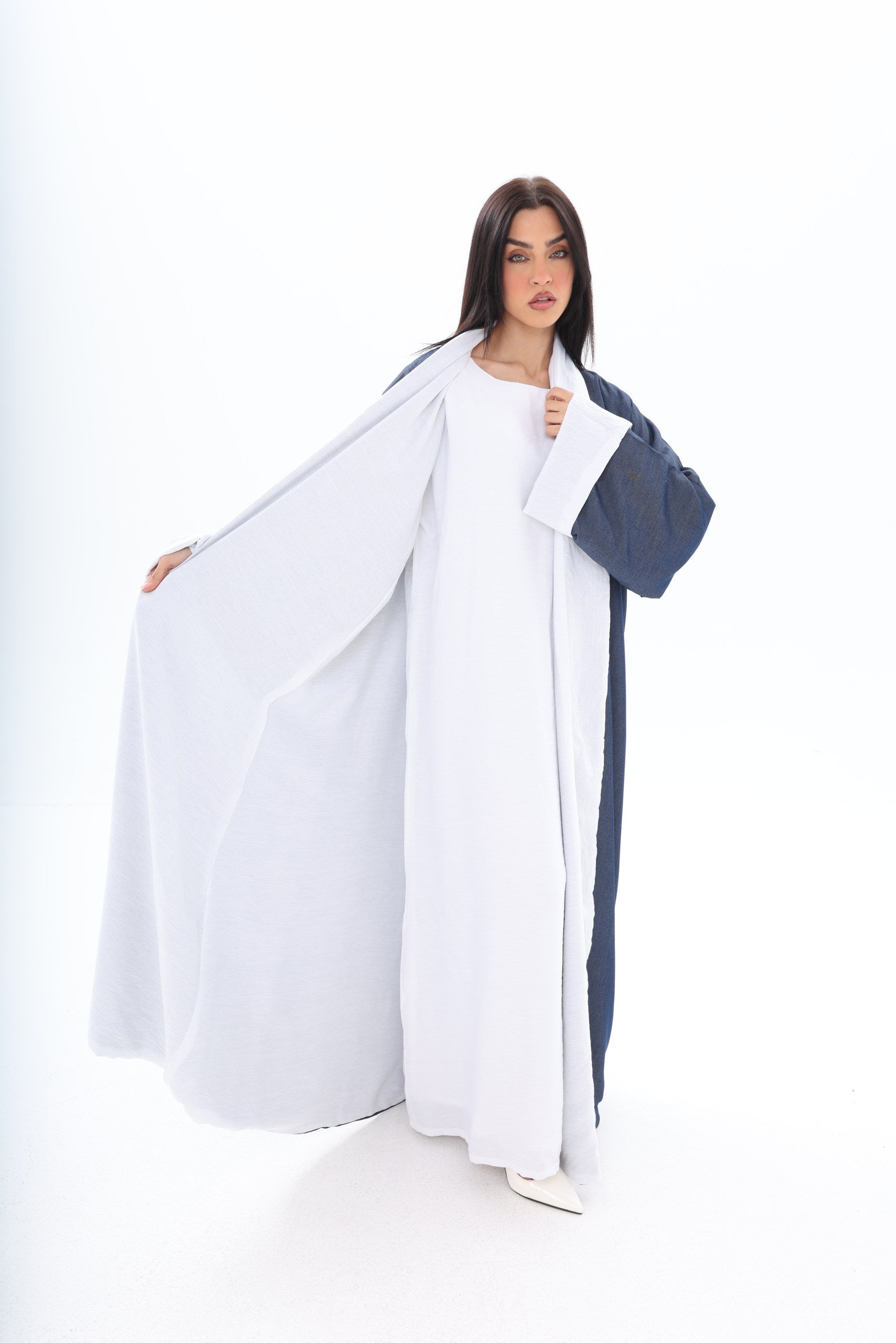 Elevate your wardrobe with Roh, a reversible abaya featuring rich dark denim for a polished, contemporary look, and crisp white linen for a fresh, elegant side. Floor-length with a flowing silhouette and optional belt, Roh blends comfort, style, and versatility, perfect for any occasion. Effortlessly switch from casual chic to refined elegance.