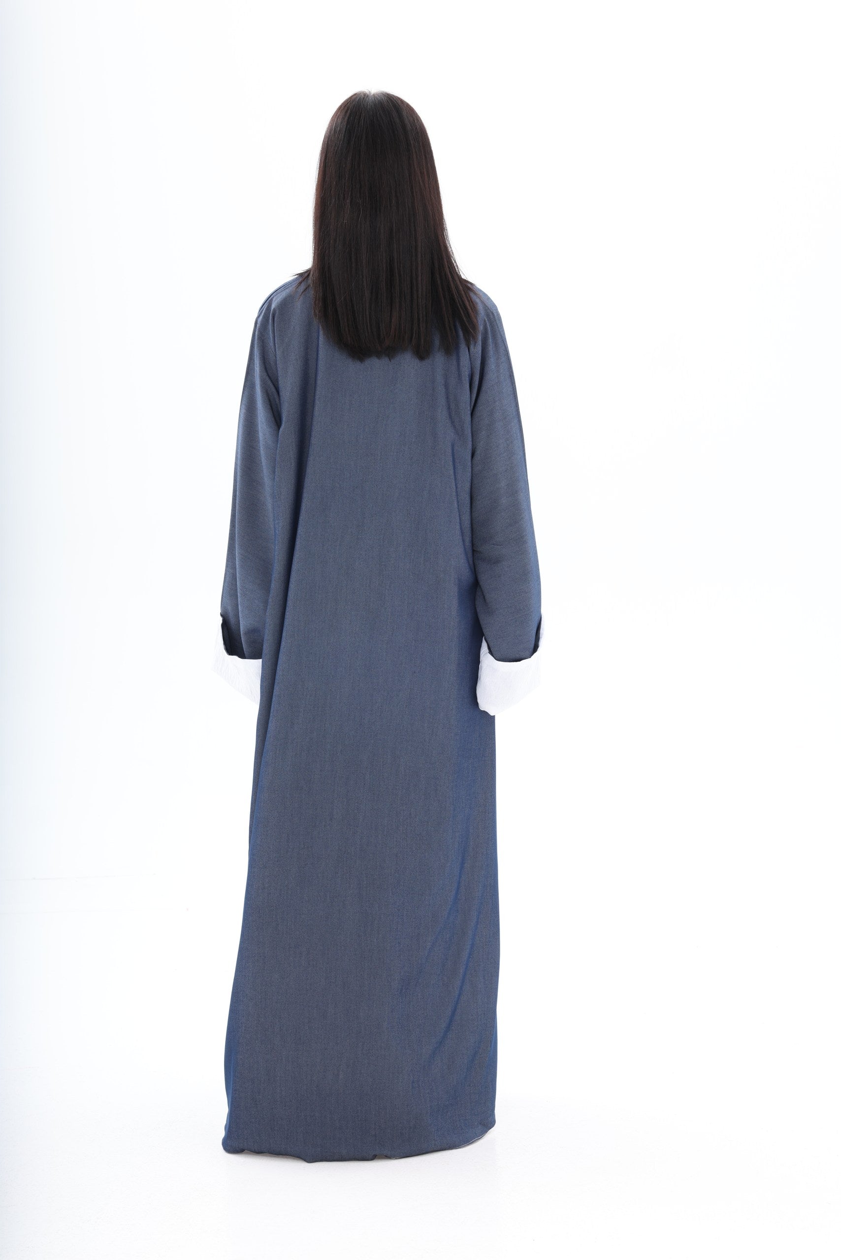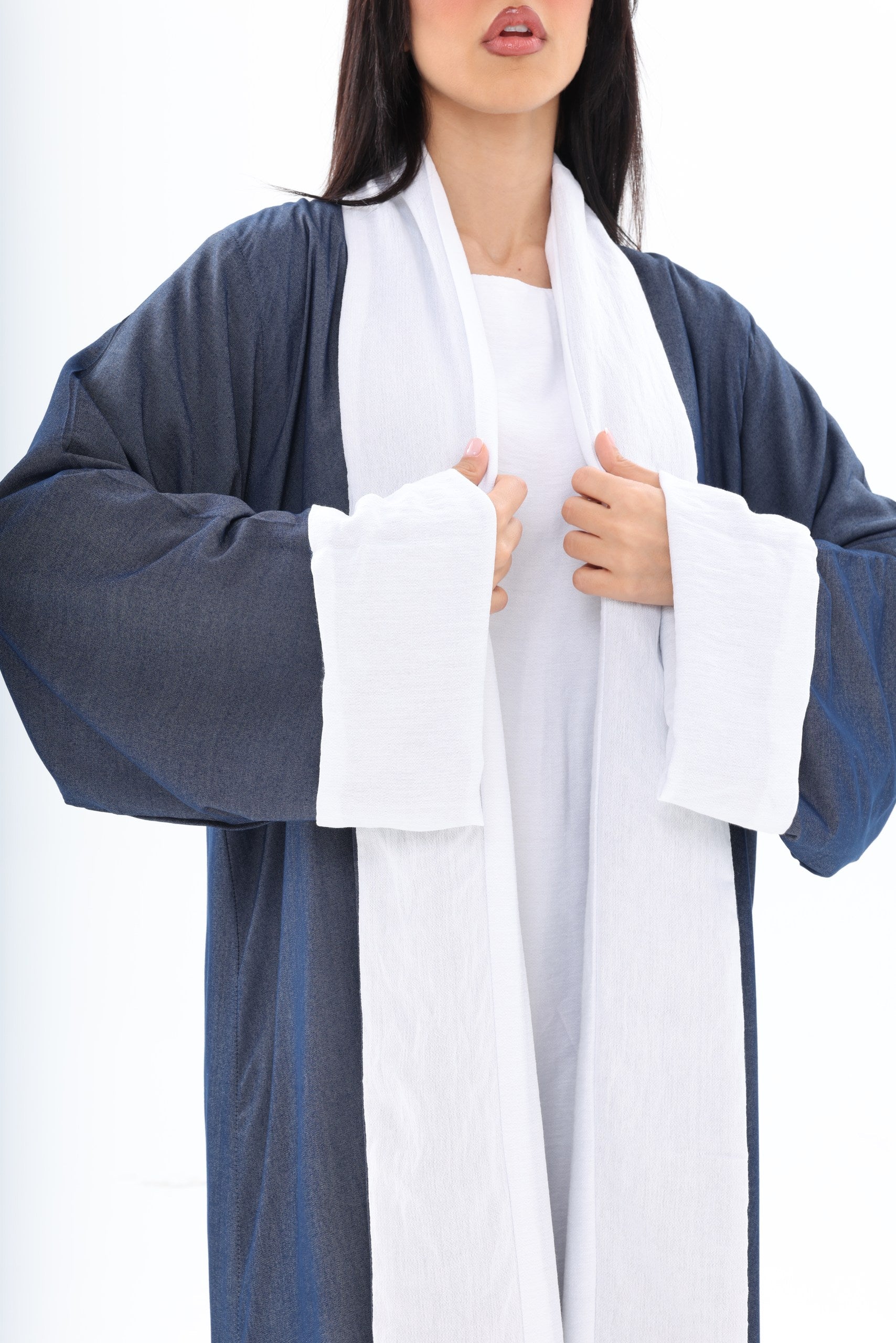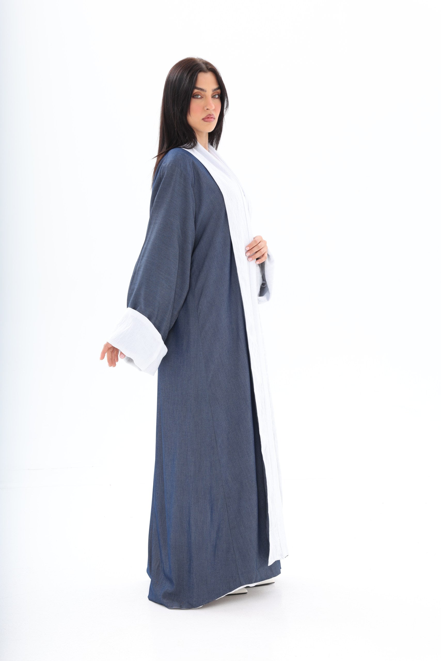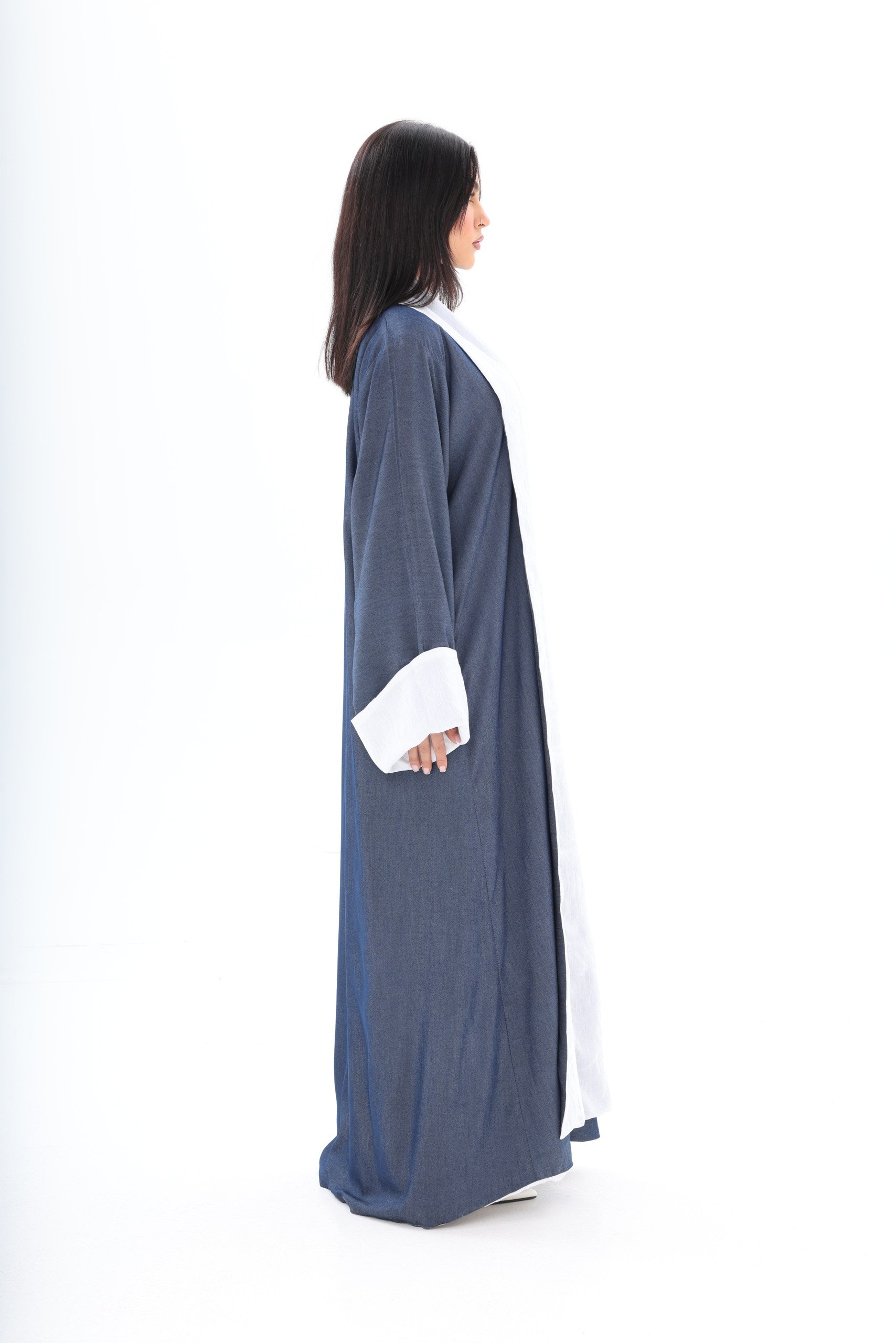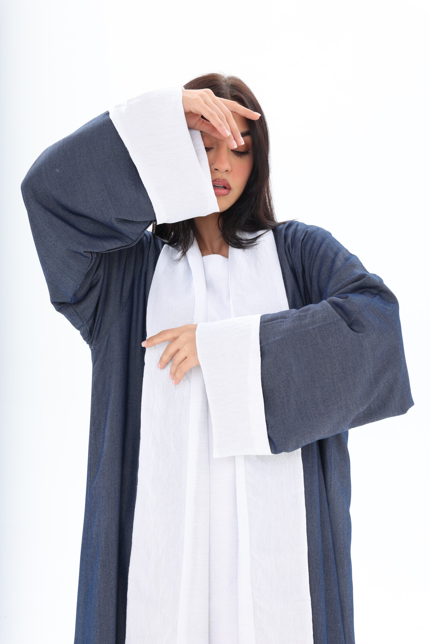 Elevate your wardrobe with Roh, a reversible abaya featuring rich dark denim for a polished, contemporary look, and crisp white linen for a fresh, elegant side. Floor-length with a flowing silhouette and optional belt, Roh blends comfort, style, and versatility, perfect for any occasion. Effortlessly switch from casual chic to refined elegance.