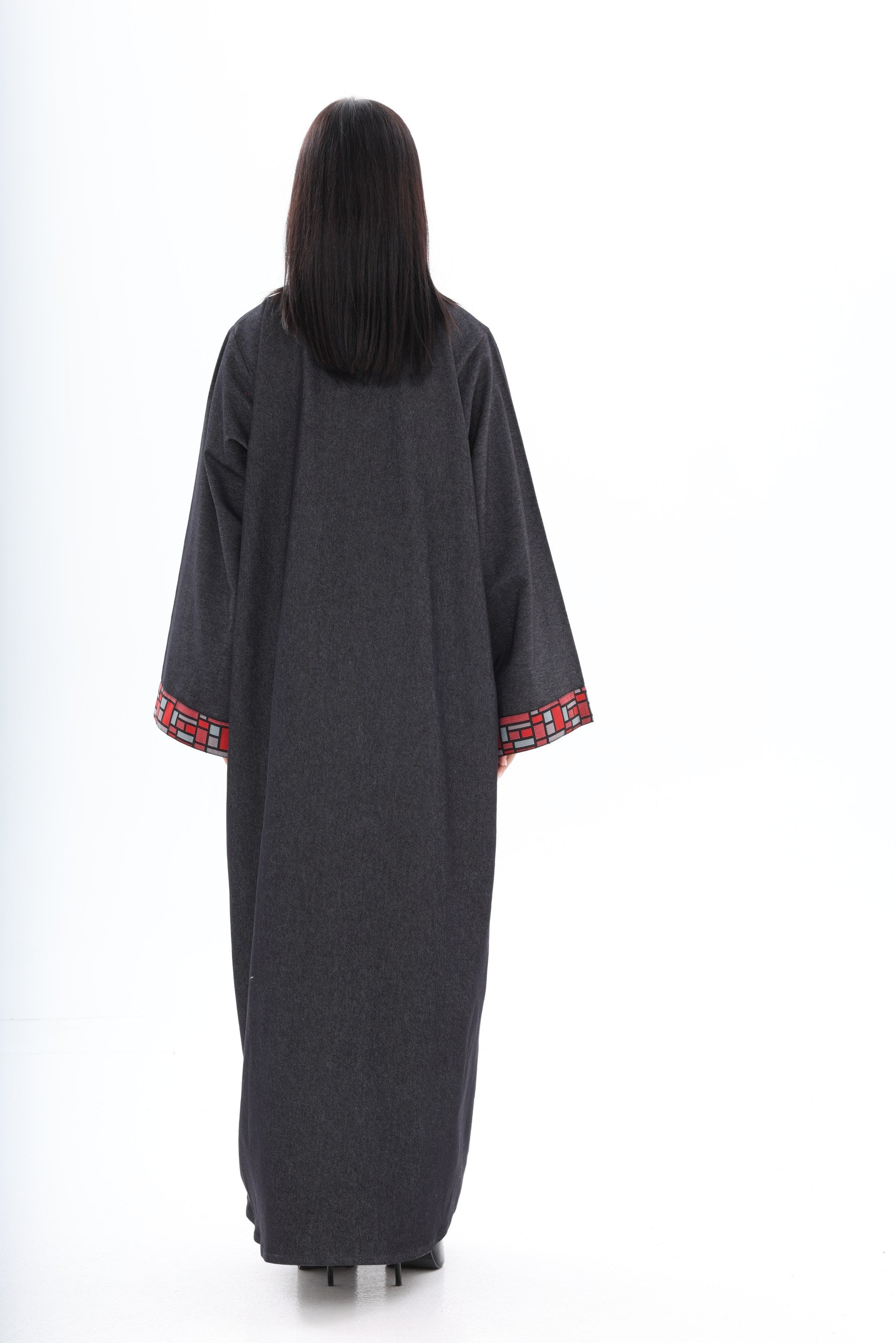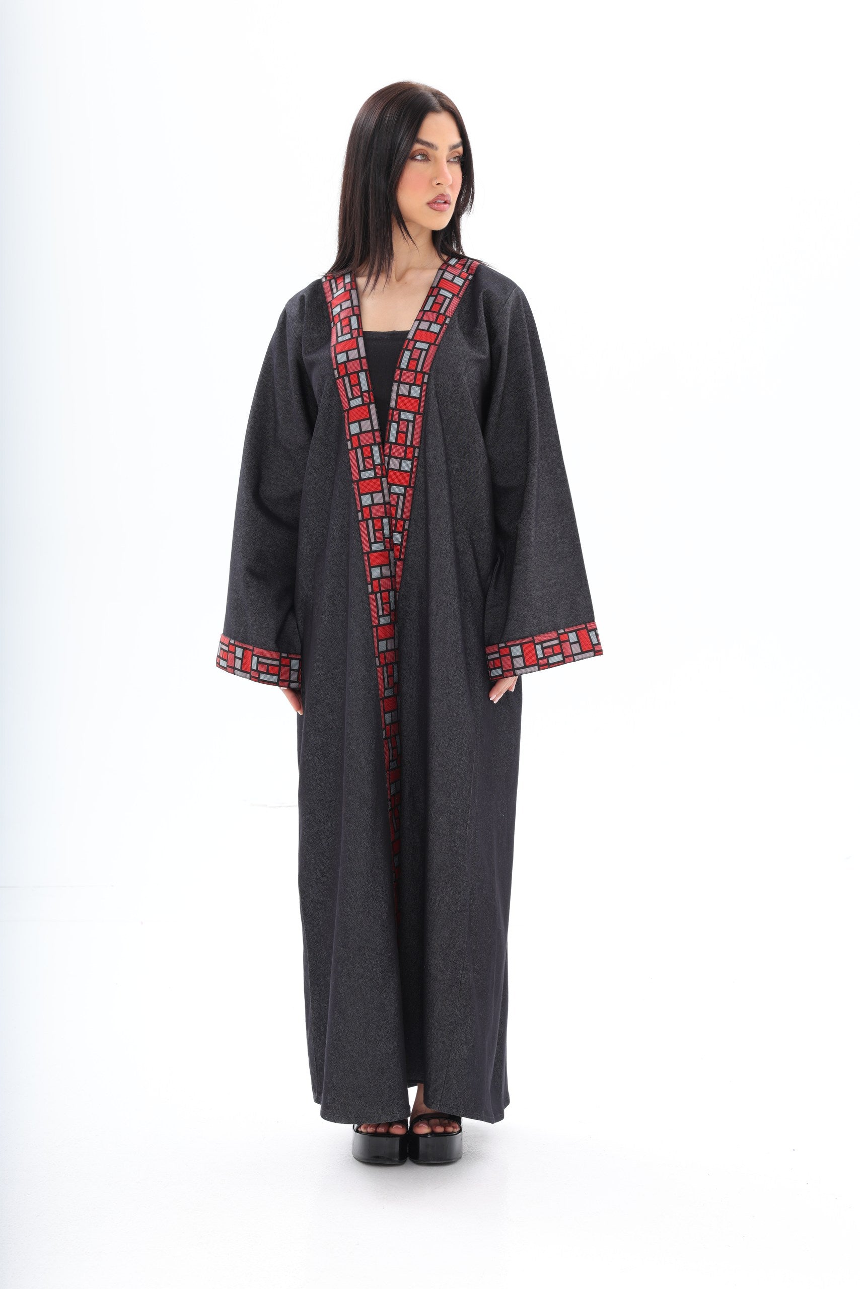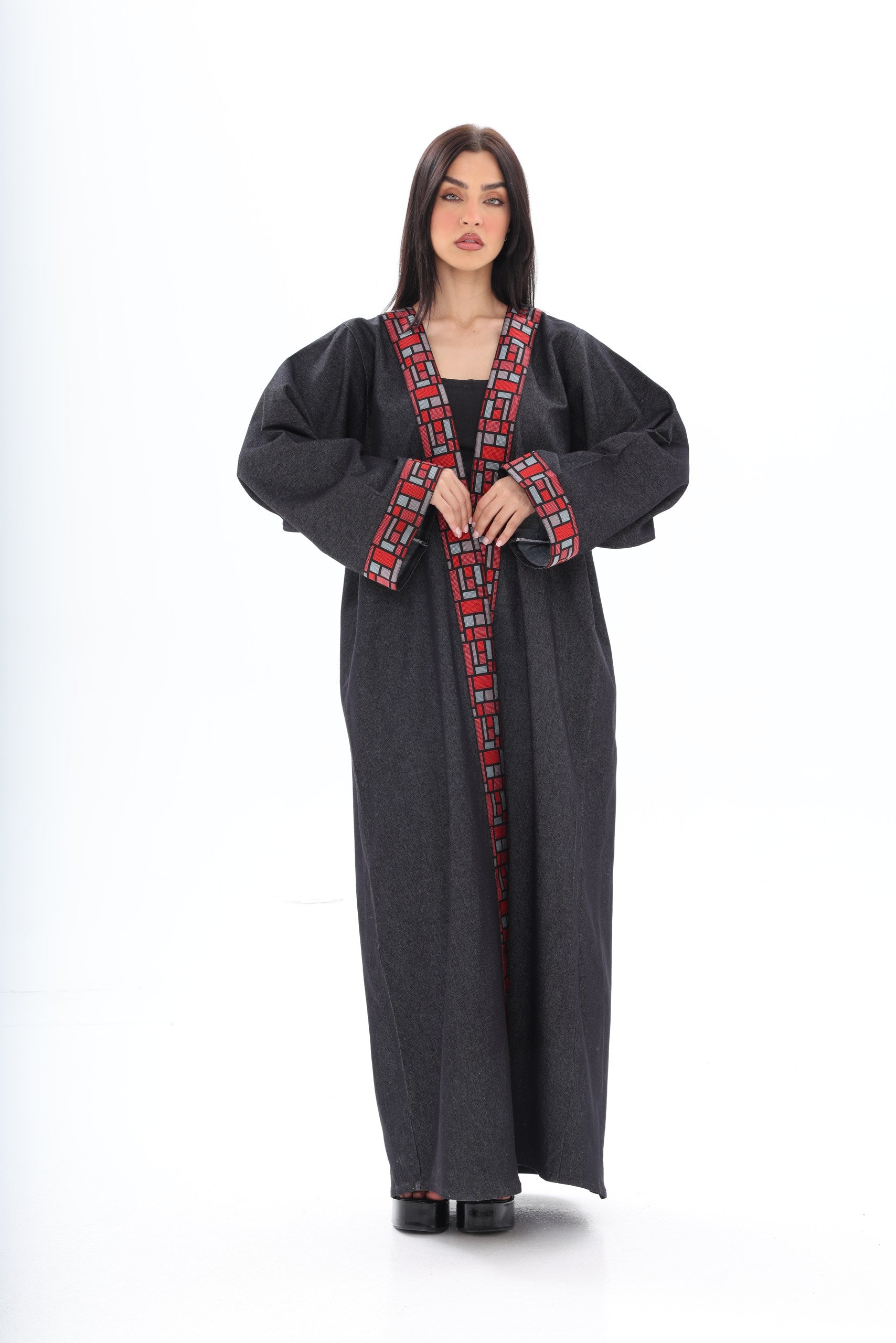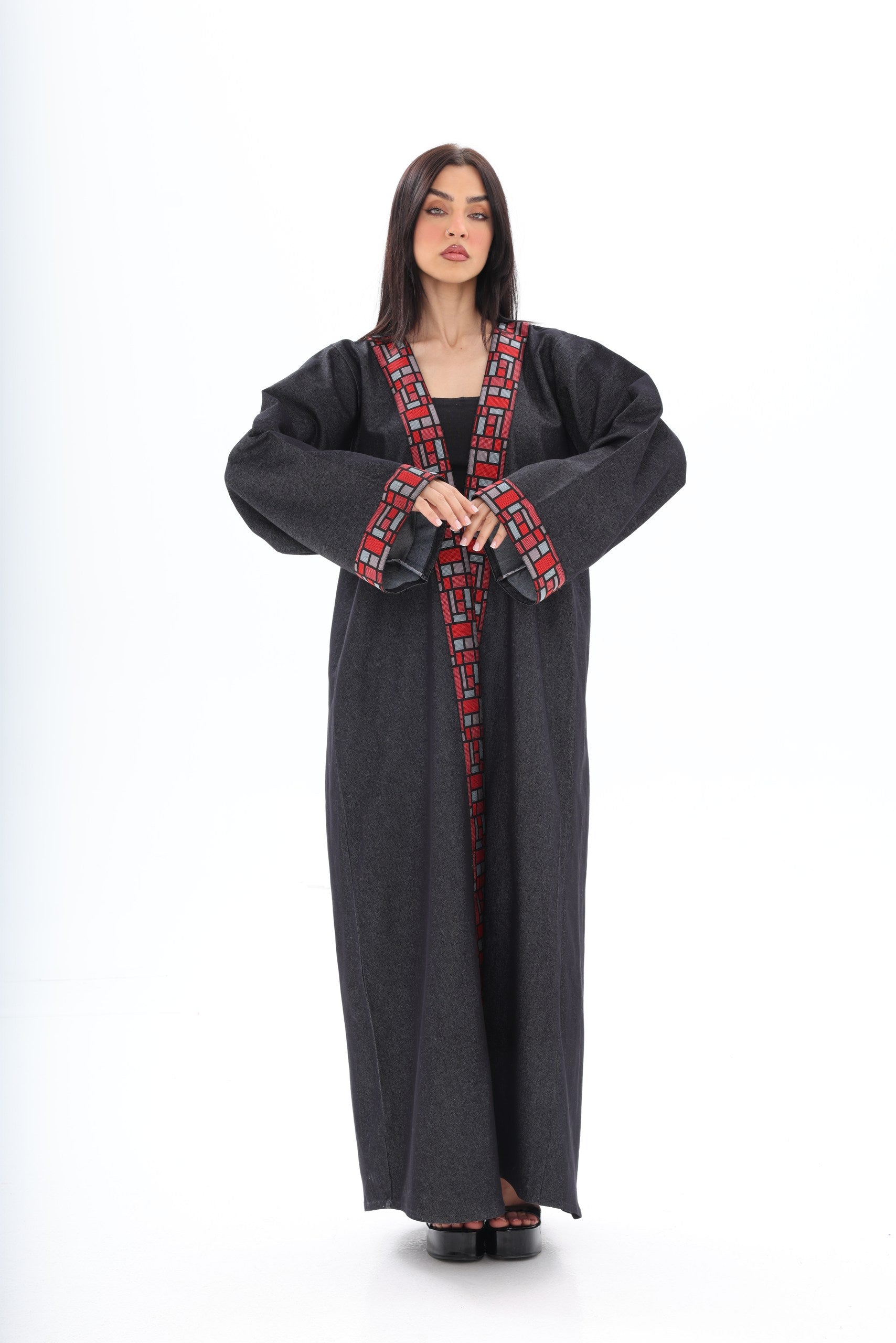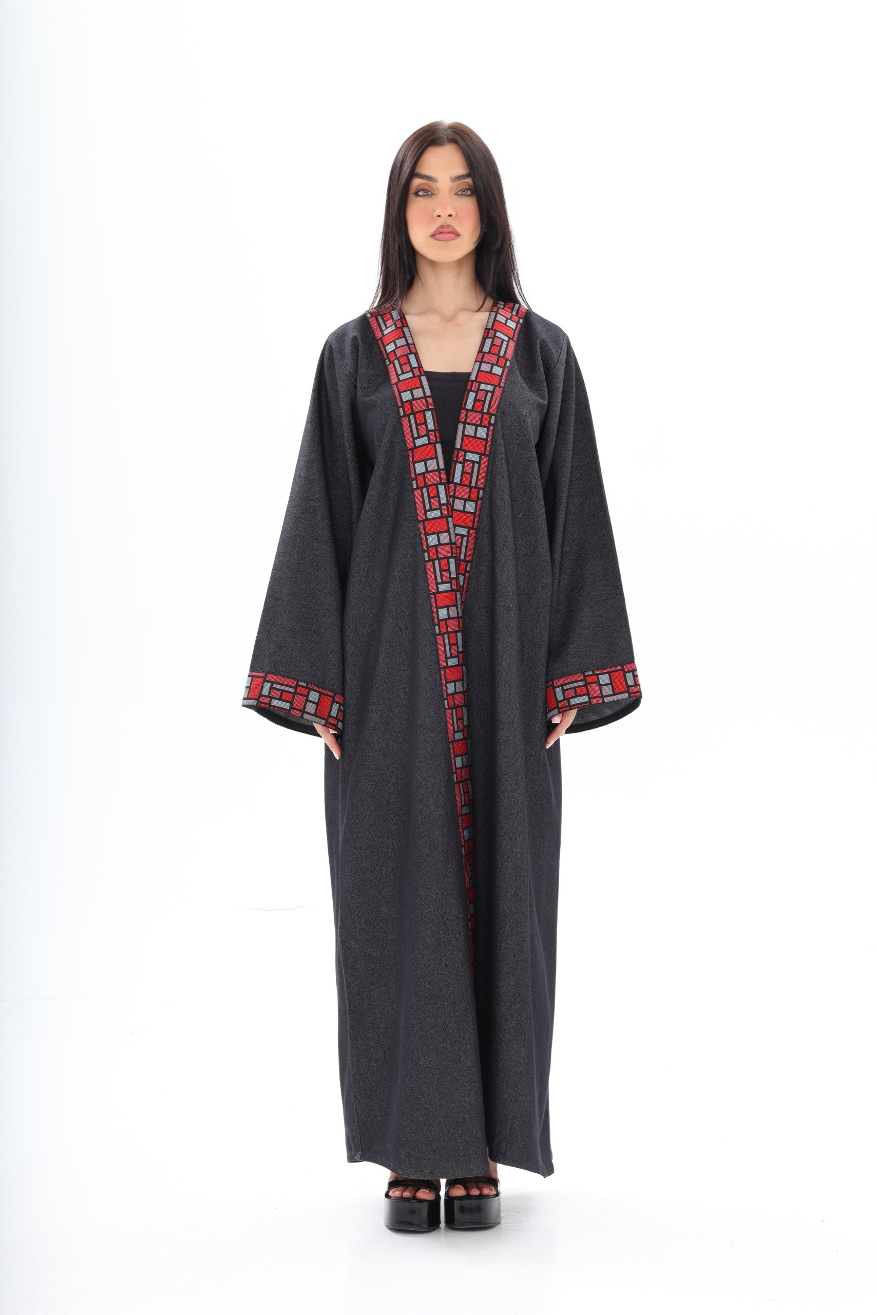 The bold red geometric embroidery along the neckline and wide cuffs introduces a powerful contrast — vibrant, artistic, and unapologetically distinctive. Inspired by architectural patterns, the detailing frames the abaya with sharp precision, adding depth and character to its minimalist base.