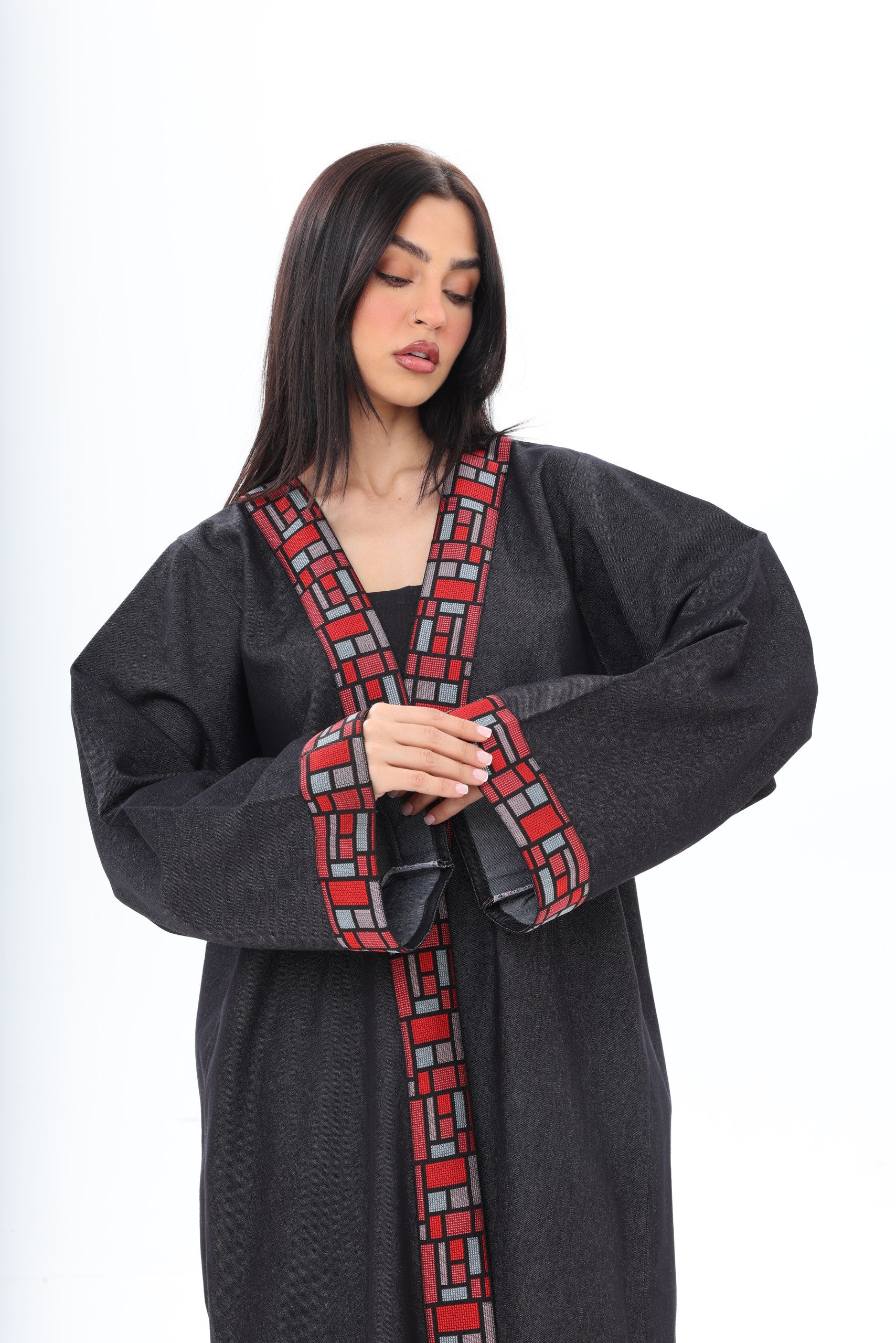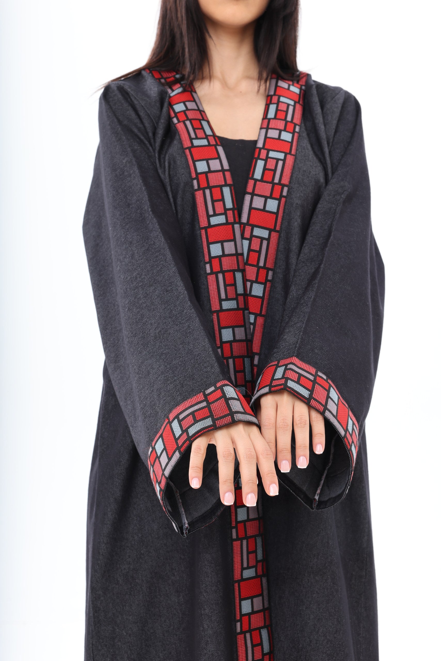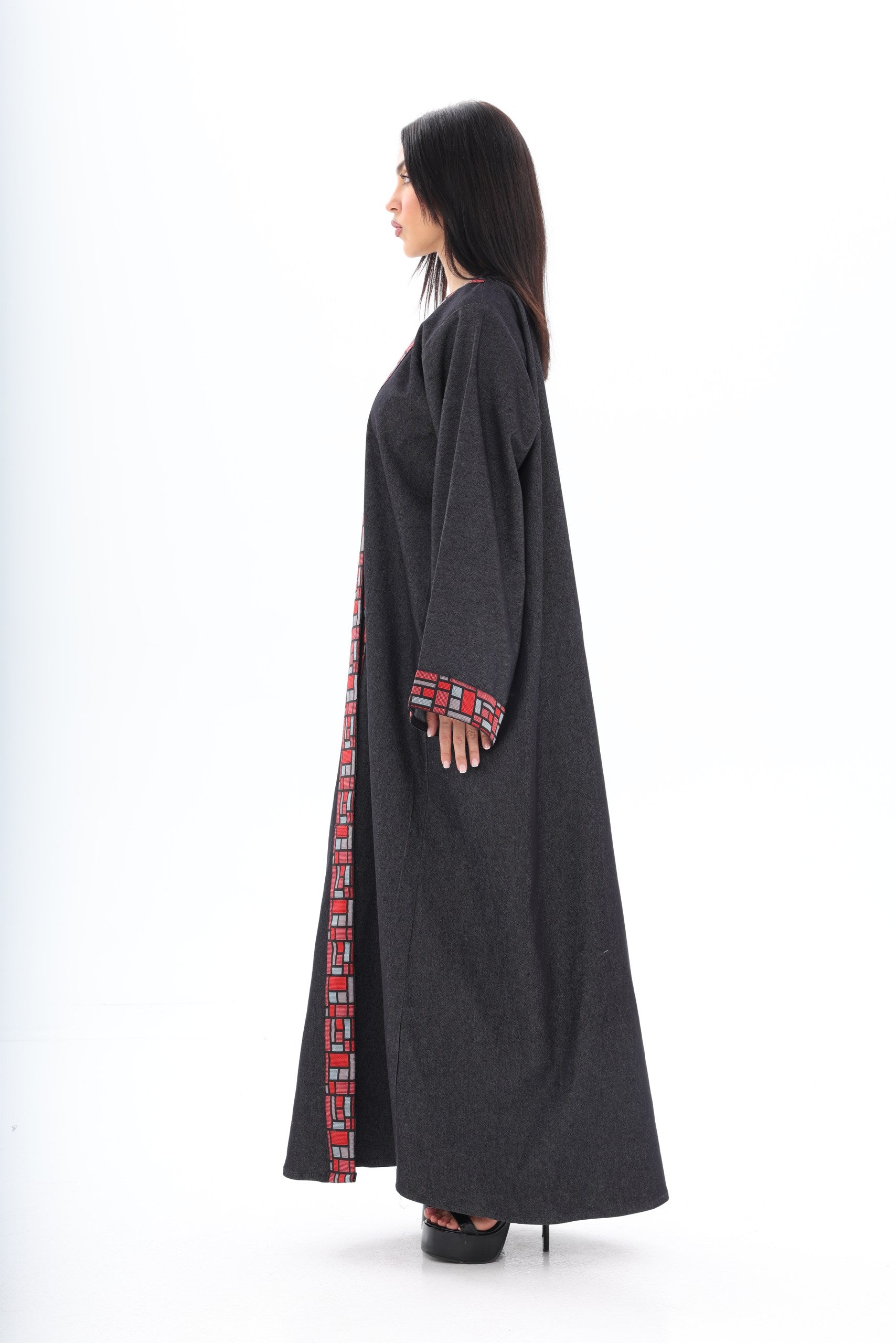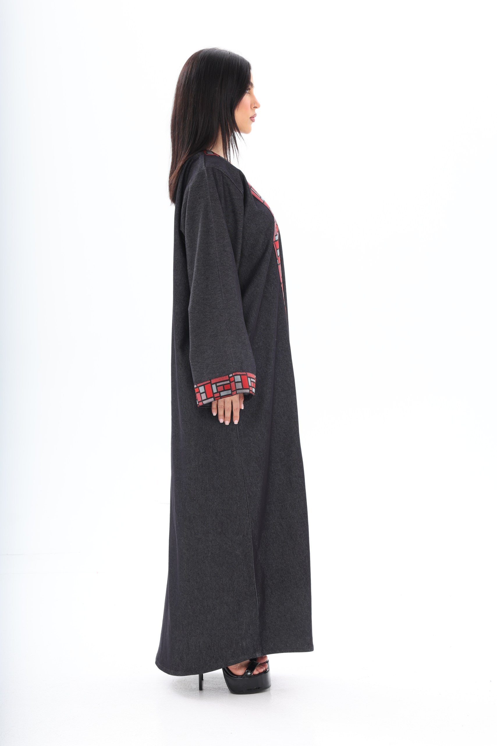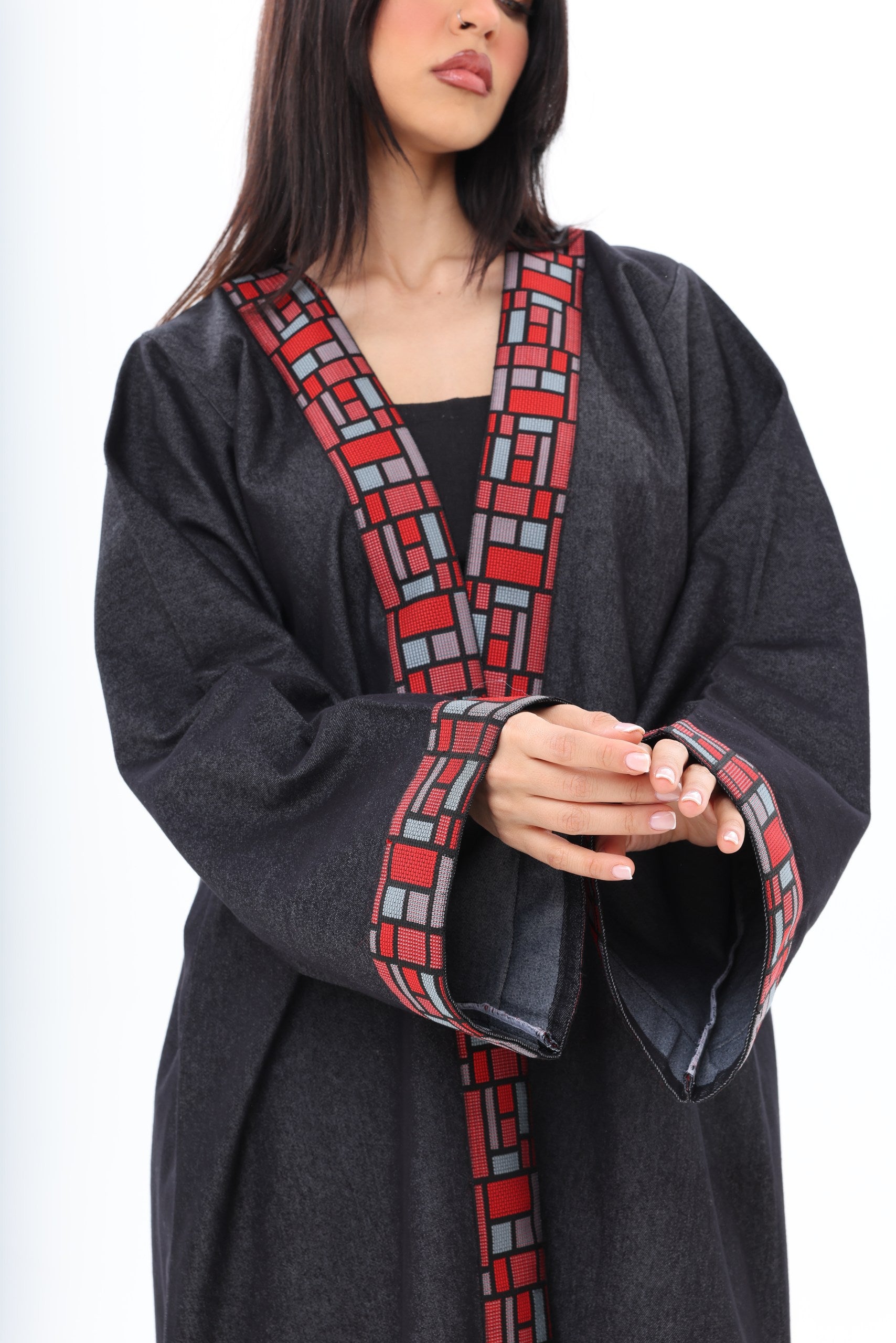 The bold red geometric embroidery along the neckline and wide cuffs introduces a powerful contrast — vibrant, artistic, and unapologetically distinctive. Inspired by architectural patterns, the detailing frames the abaya with sharp precision, adding depth and character to its minimalist base.